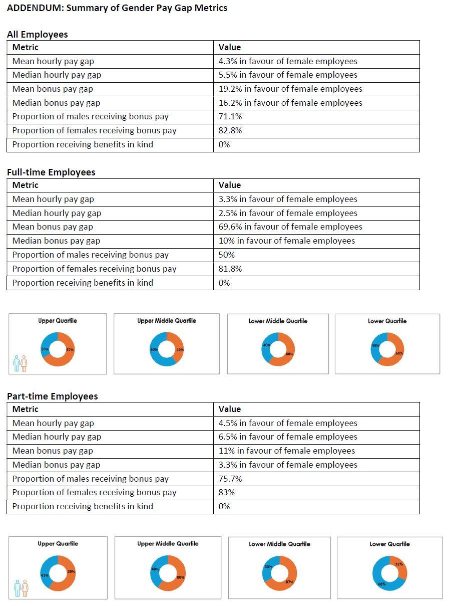 The mean gender pay gap difference of 8.8% is predominately driven by the variance in the hourly paid rate of more senior male employees versus female employees. This is attributed to the fact that a larger number of females are employed in the lower quartile compared to men and we have a higher proportion of female employees under 21 where the national minimum wage is lower.