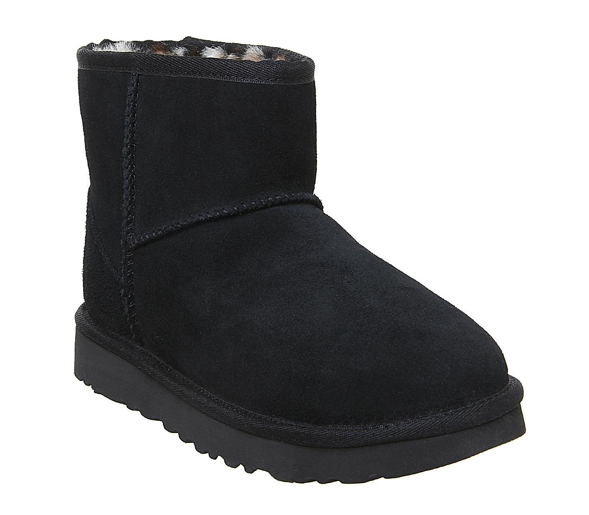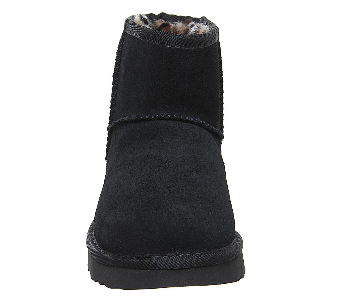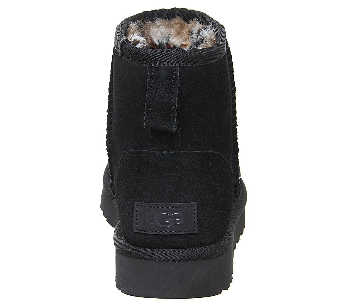 Constructed with premium materials, the instantly recognisable Classic Mini now comes with a fun leopard printed sheepskin lining. Can be worn cuffed or non-cuffed! Featuring a pre-treated suede upper to repel water and stains as well as the Treadlite Ugg sole, providing even more comfort and traction than ever before. Finished with UGG suede branding on the back. This iteration features a black upper and colourful printed lining.