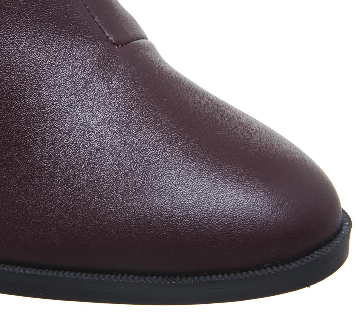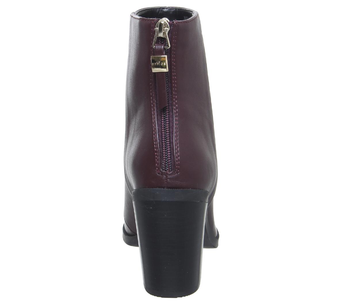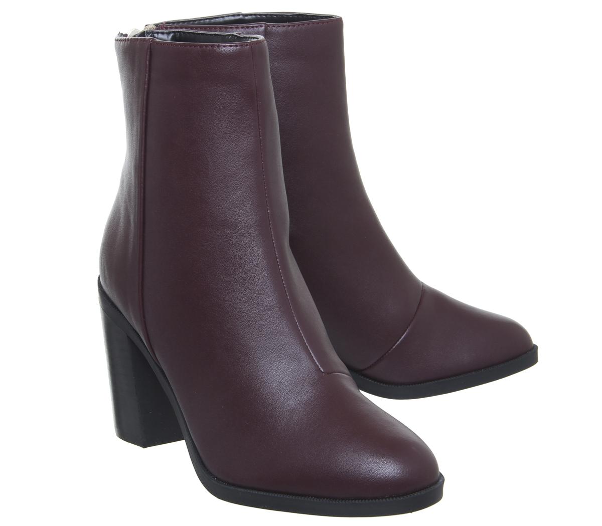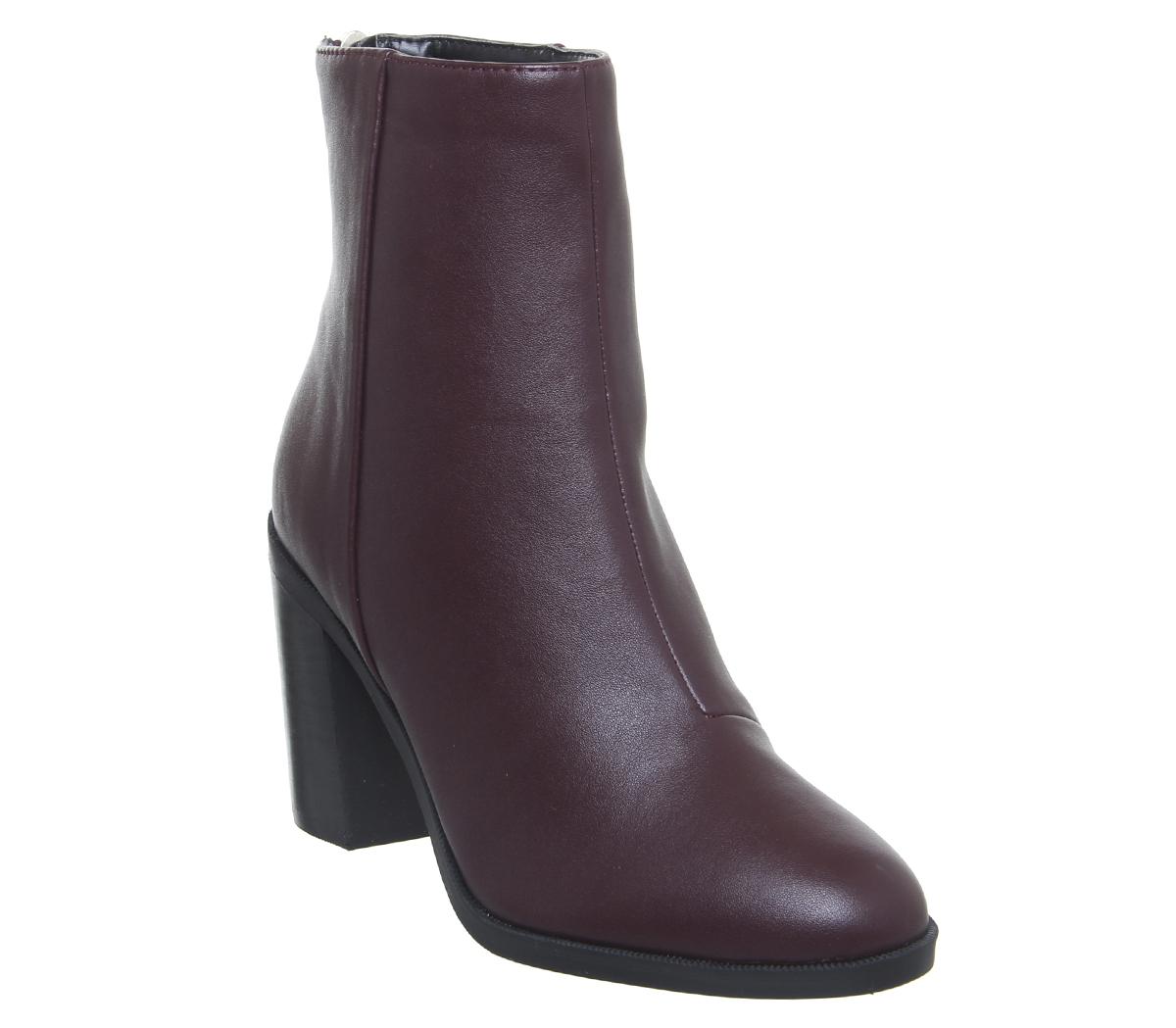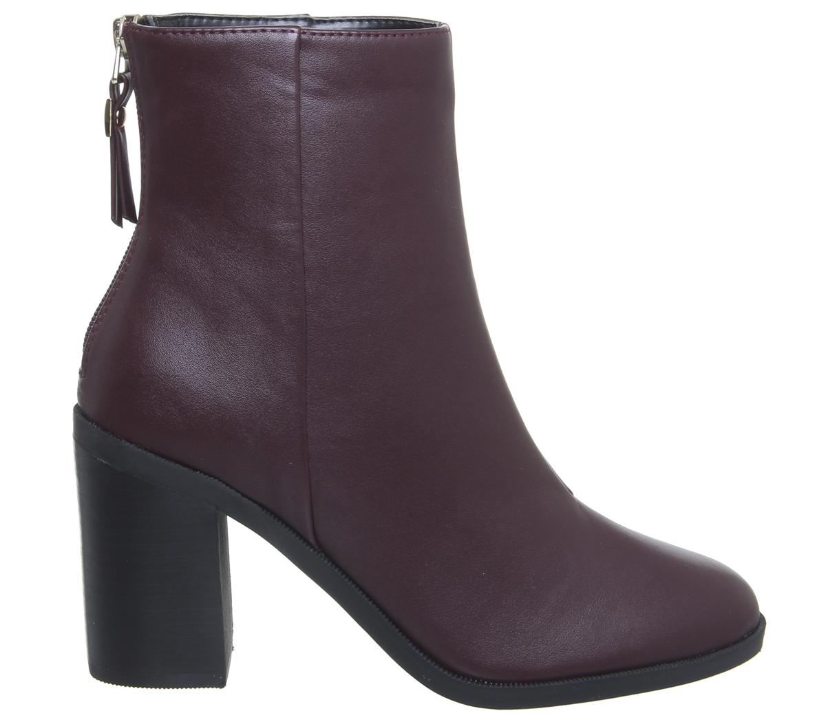 A casual ankle boot to dress up an outfit. Featuring a burgundy upper, contrasting chunky heel and a back zip.
