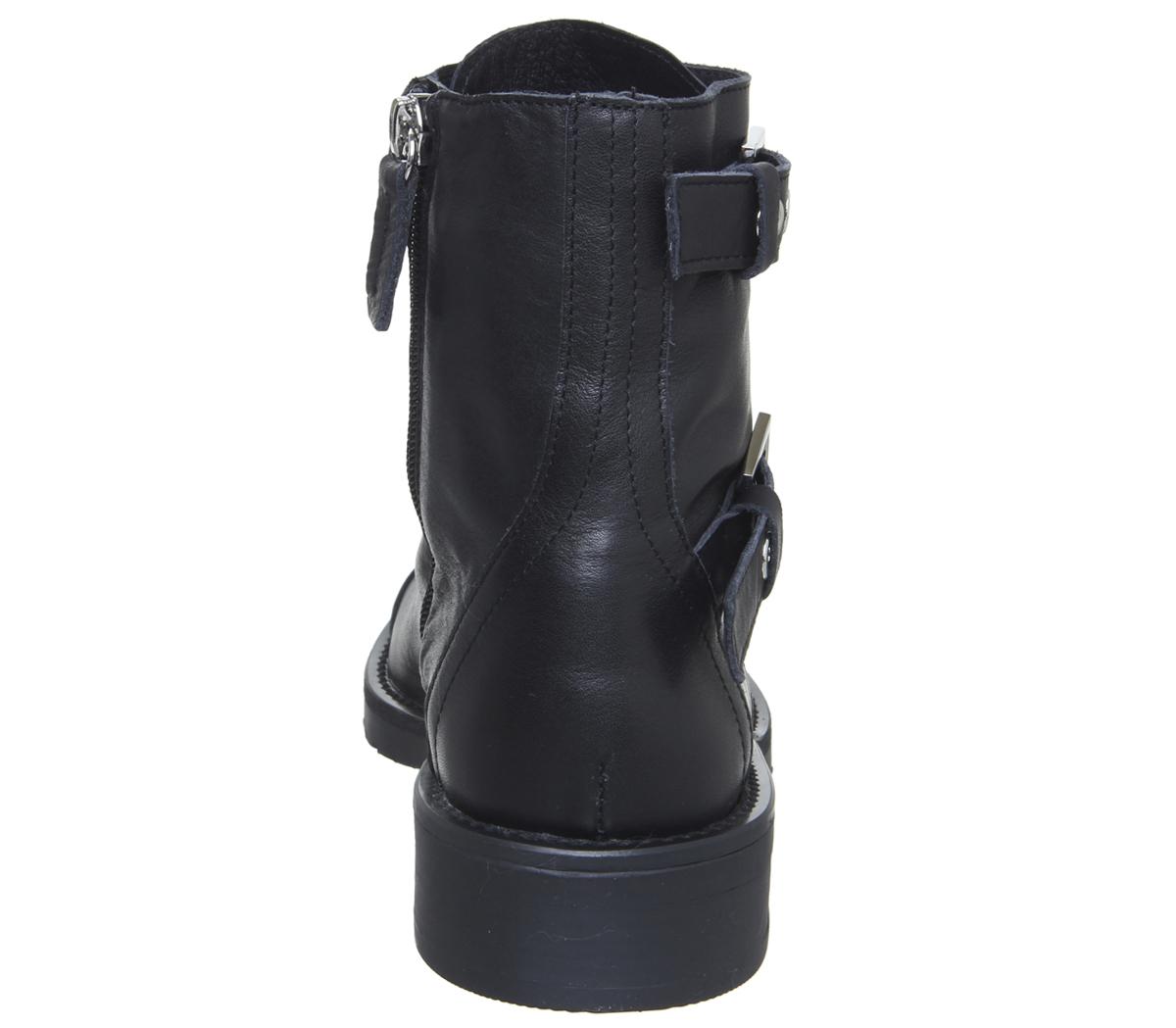 A biker inspired boot adorned with a hardware detailing. Featuring leather uppers with a side zip