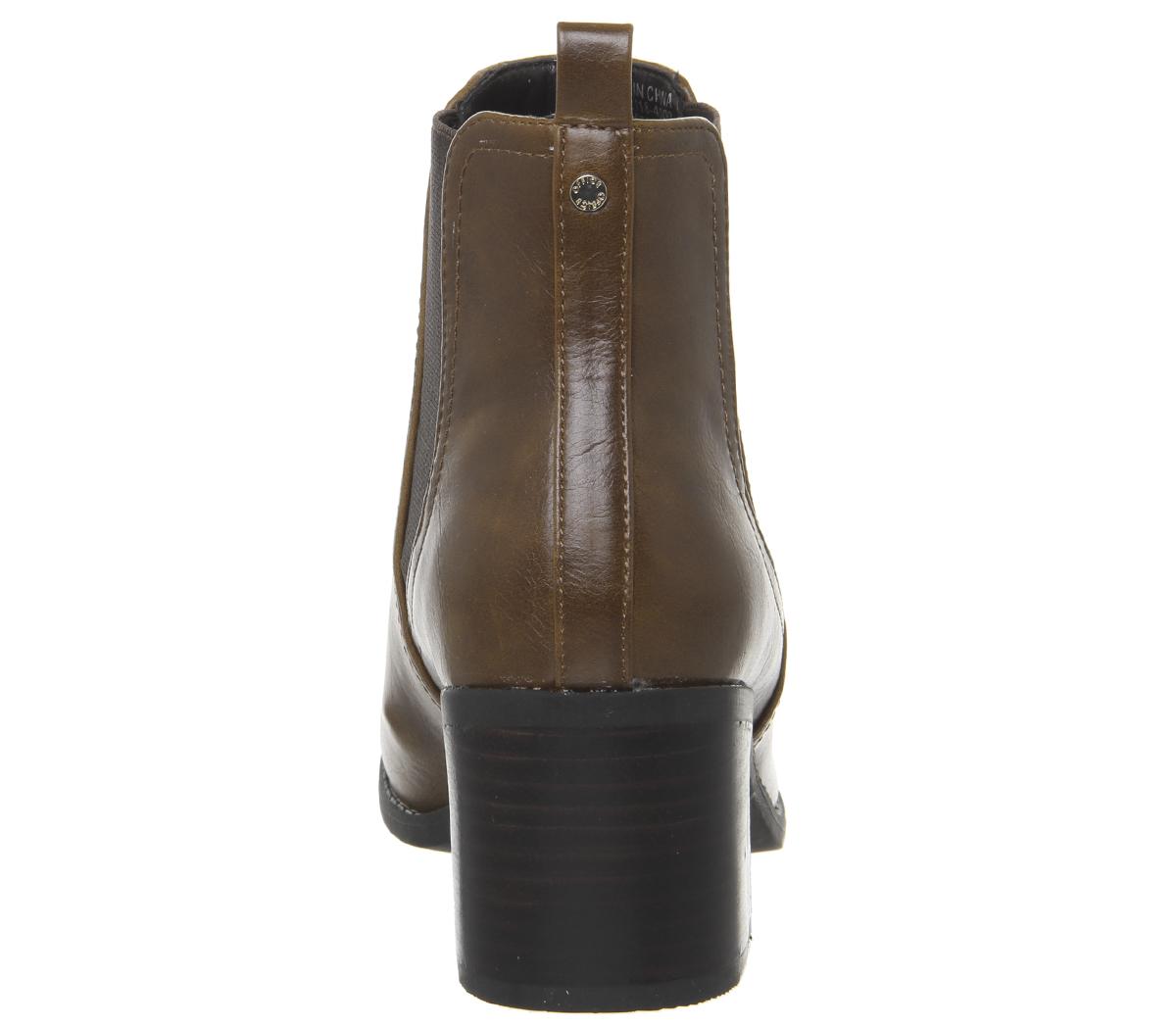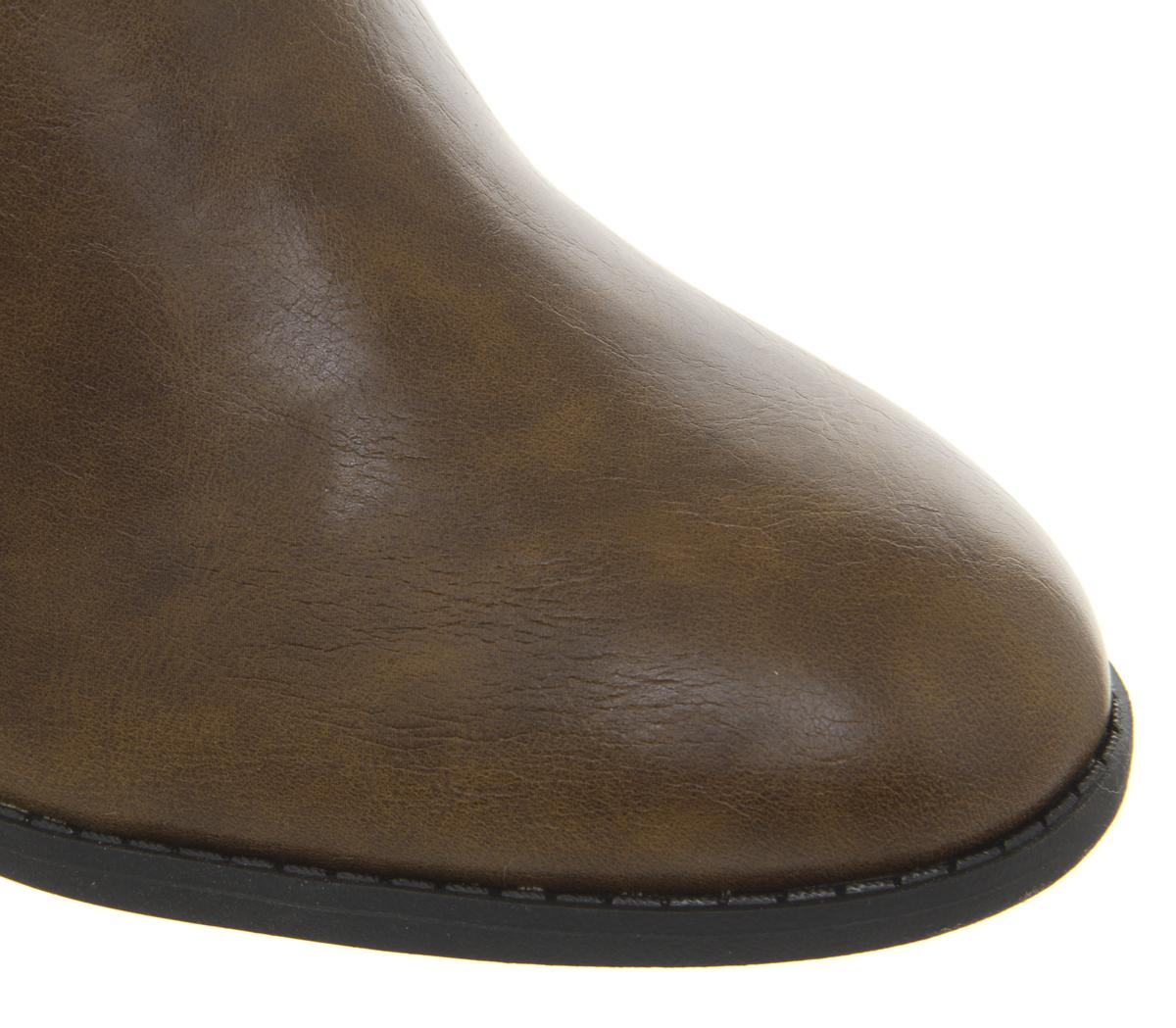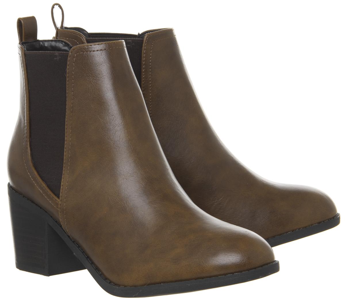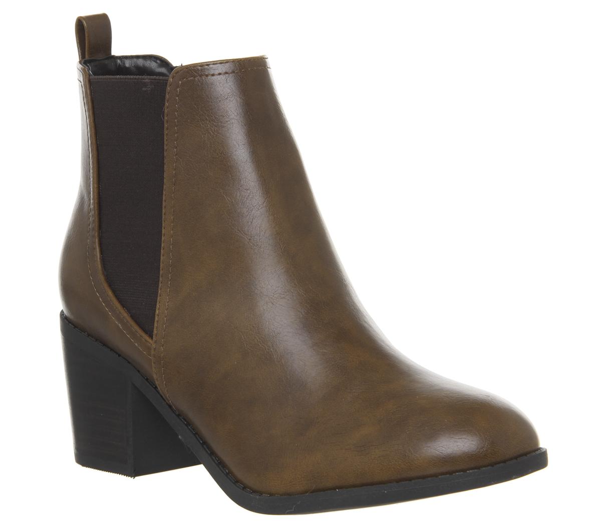 All-day, everyday boots featuring a tan synthetic upper, elasticated sides and a slight heel.