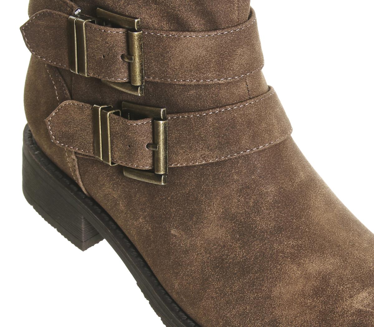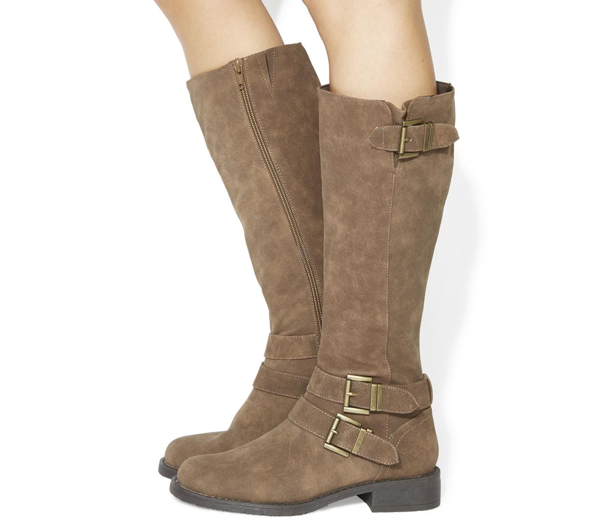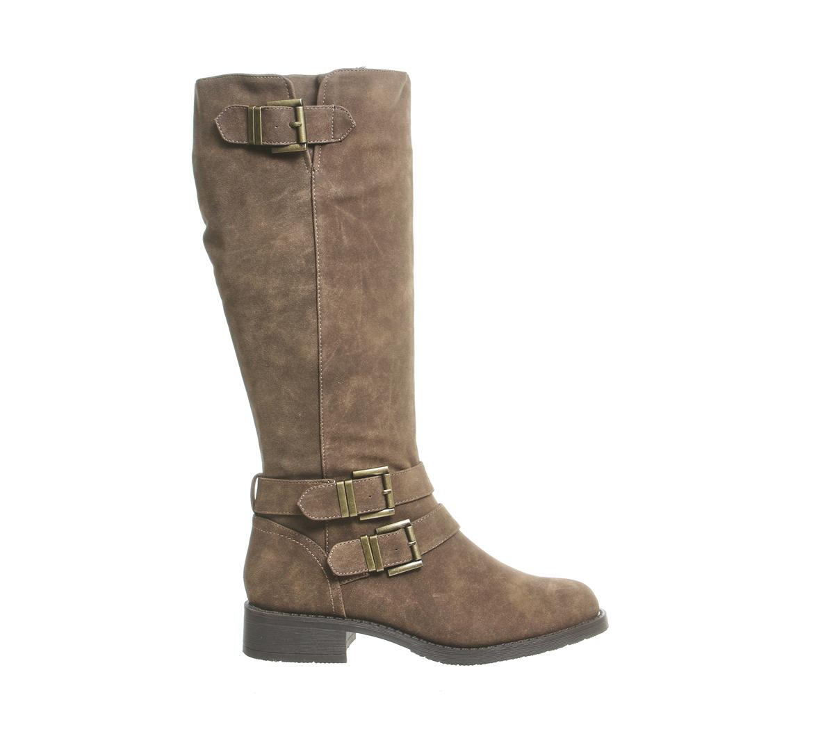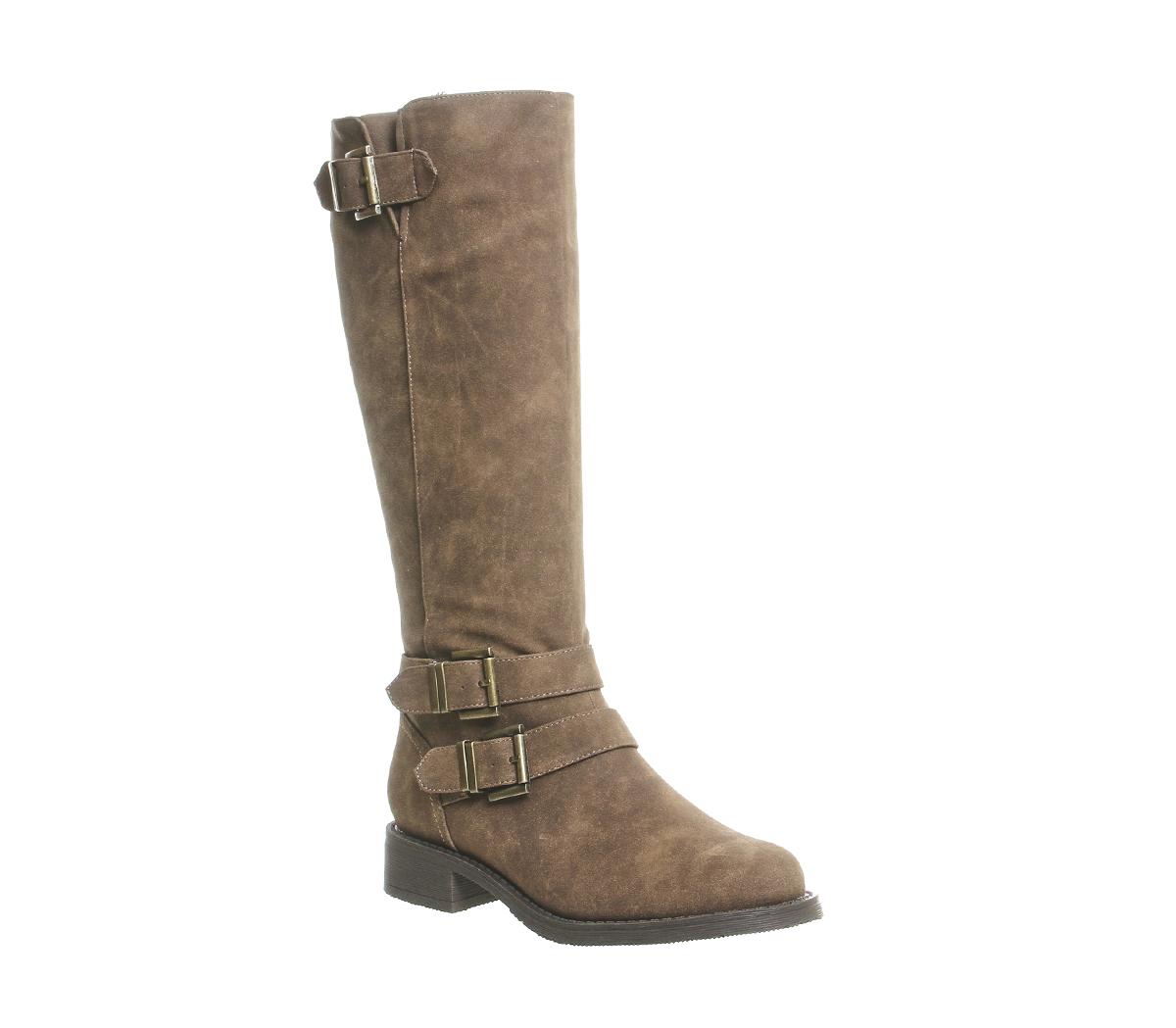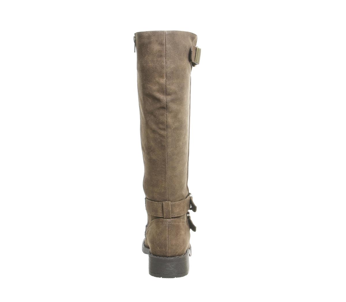 Biker style knee boots with multi strap and buckle detailing and small block heel.