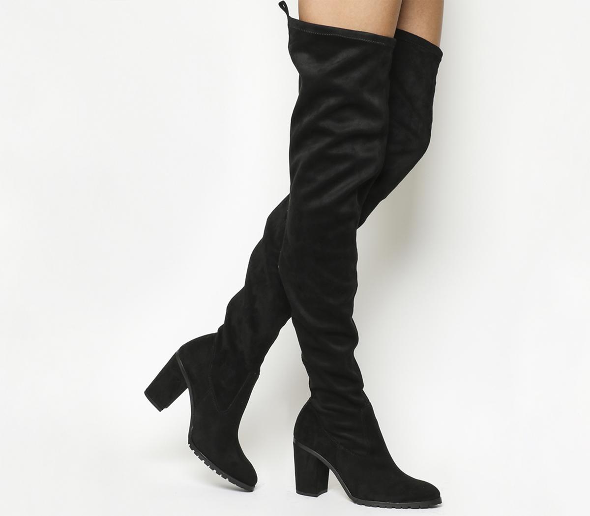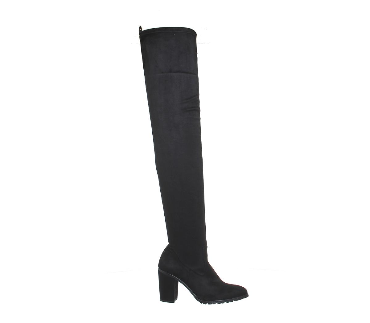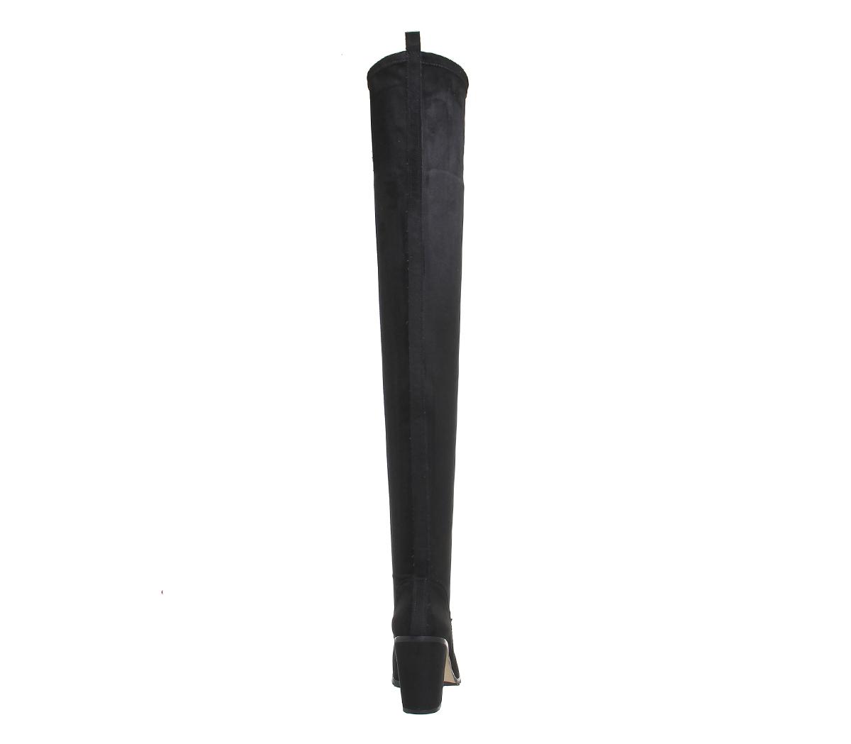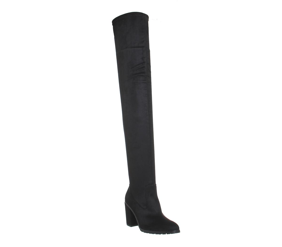 Over the knee boots with black microsuede upper with pointed toe and block heel.