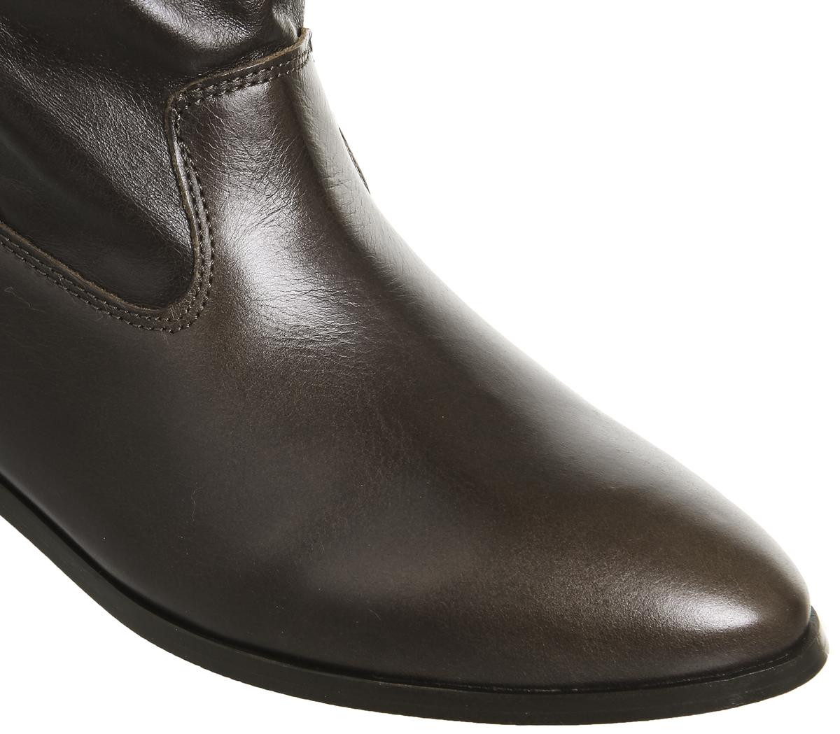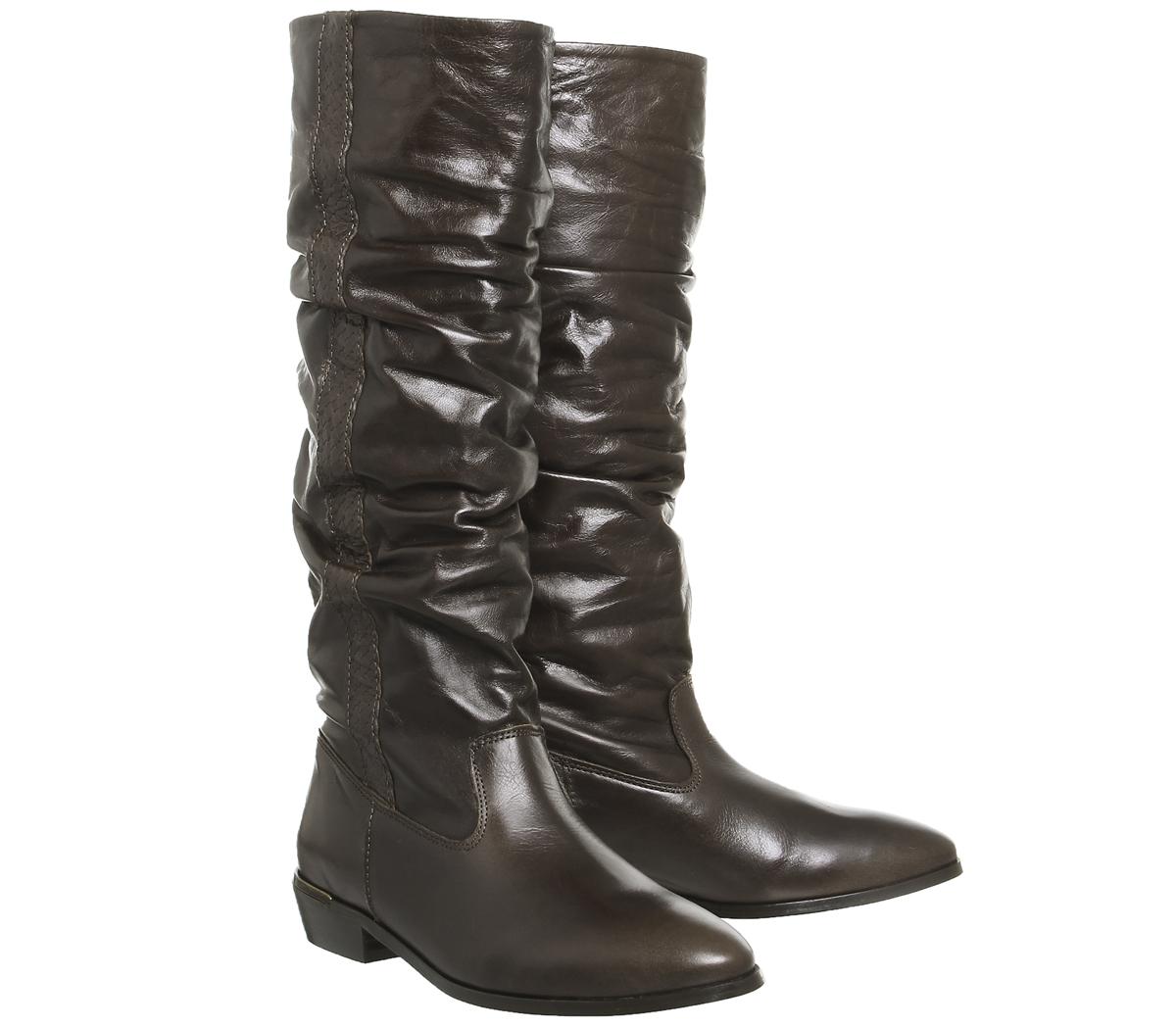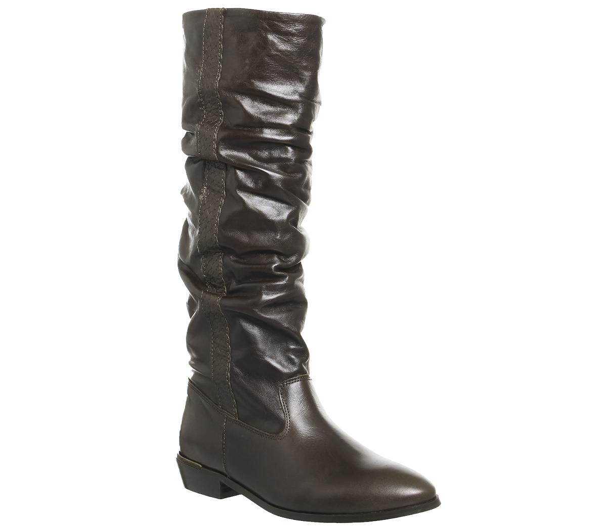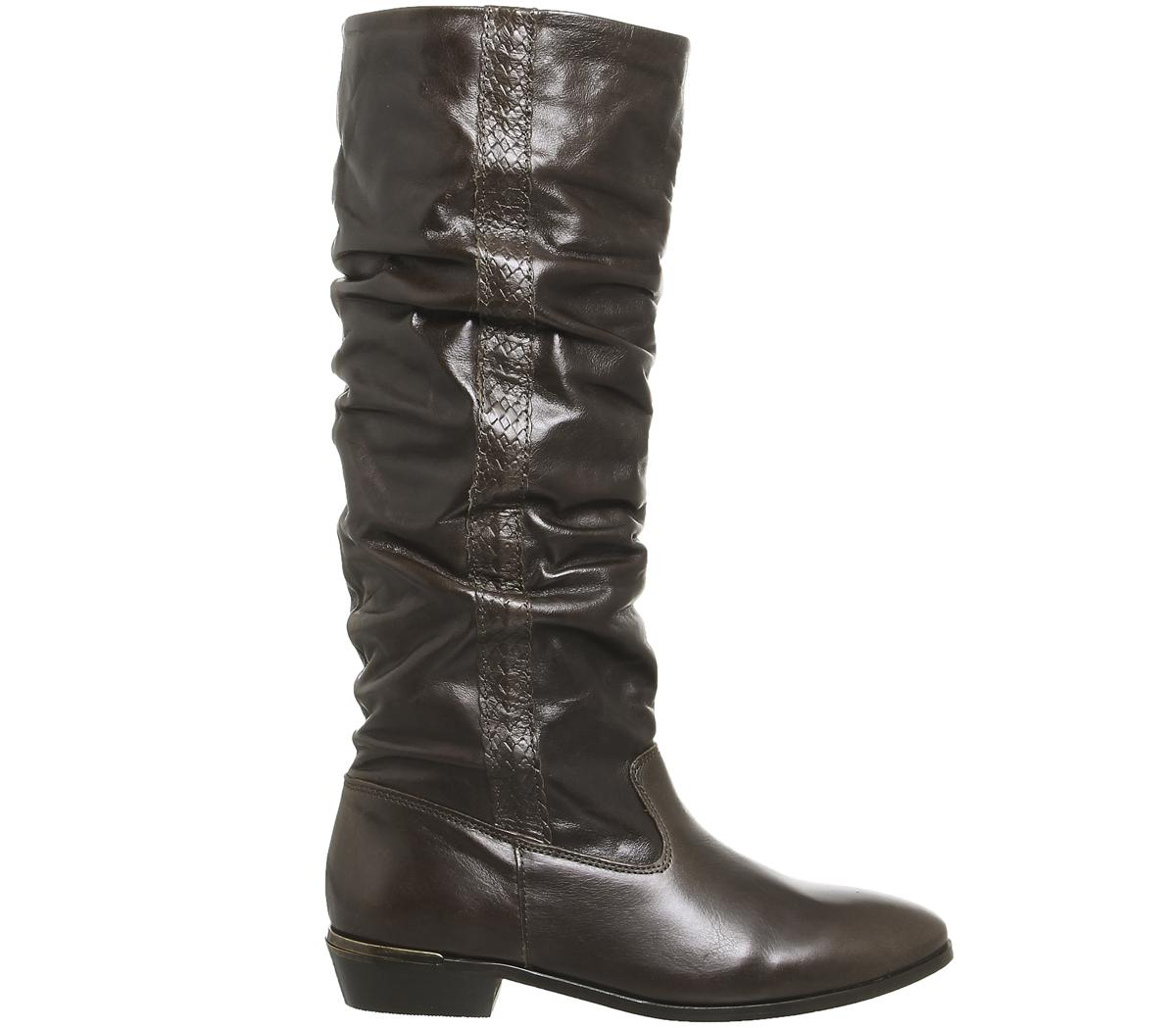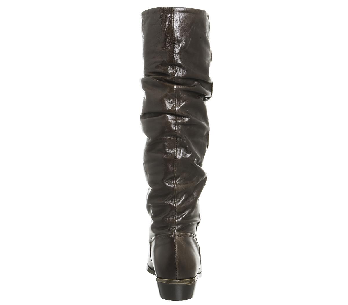 Casual, everyday knee boots with slouchy leather upper and small block heel.