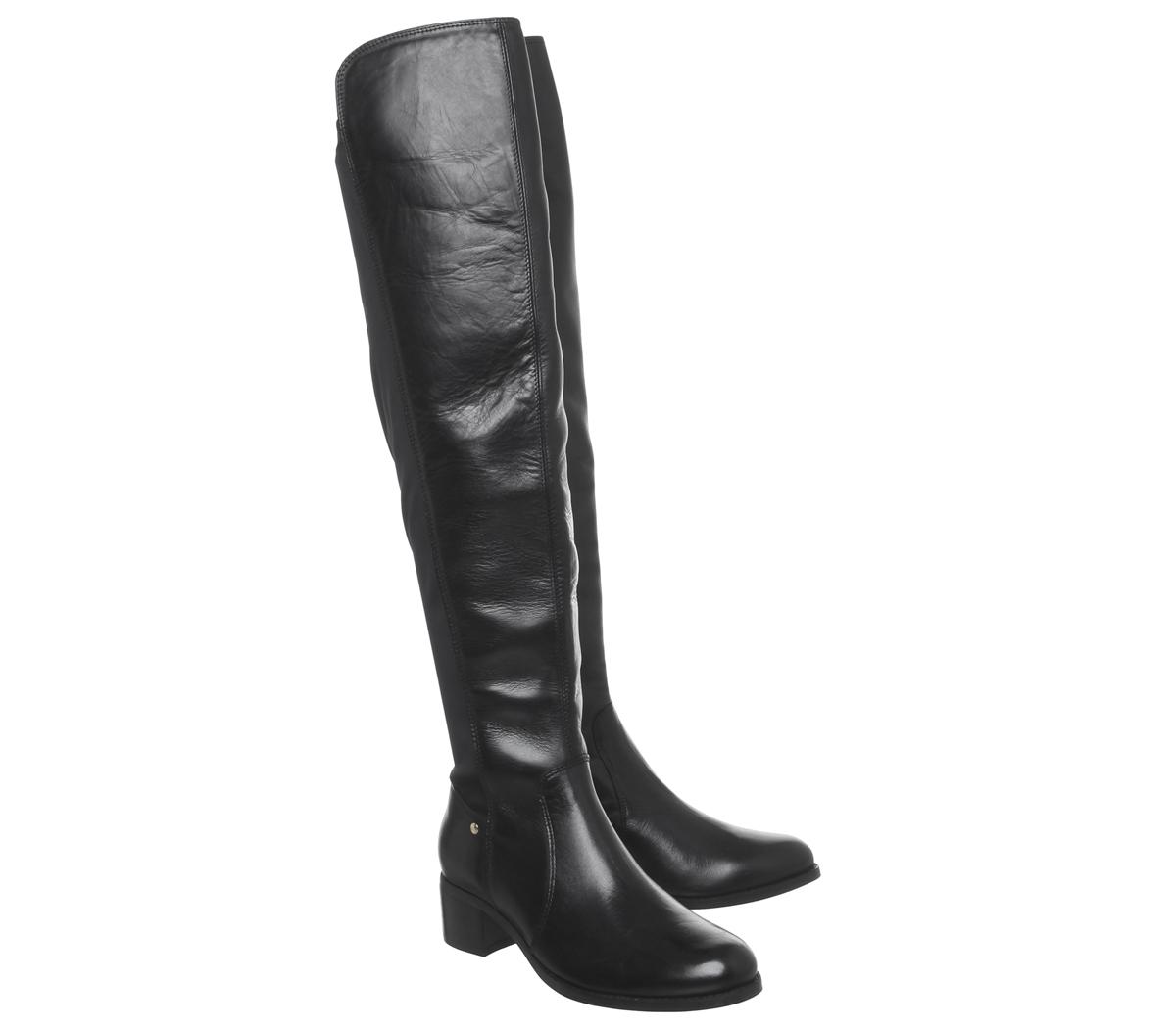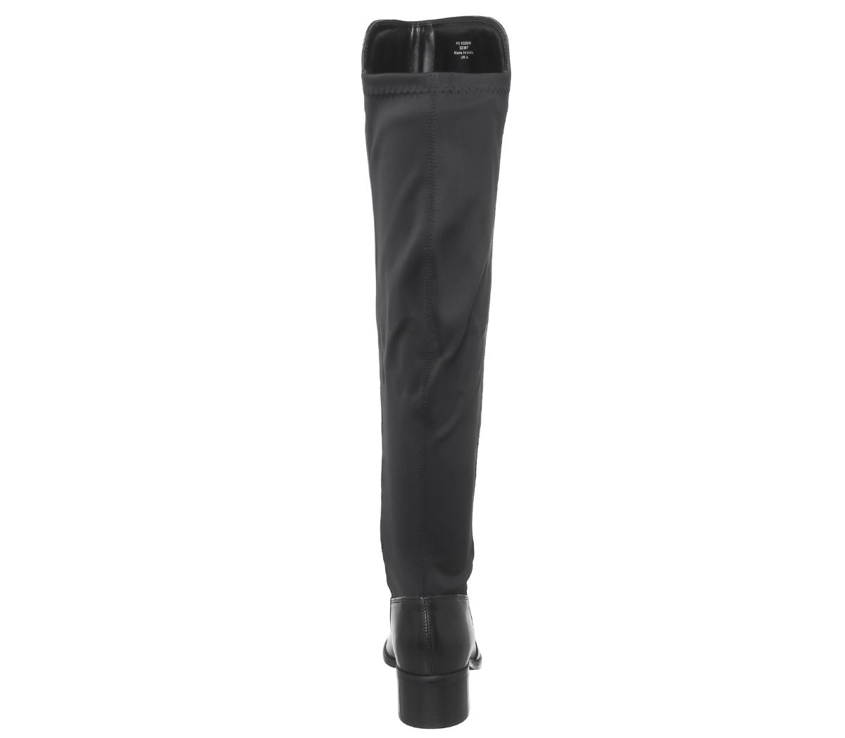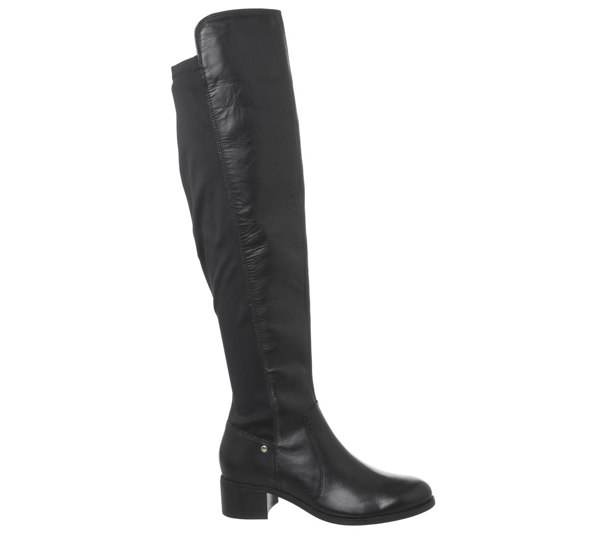 Perfect for dressing up or down, these Kite boots should be in your shoe collection. This iteration features a black leather front panel, and a stretchy textile back panel. Finished with gold stud and short block heel.