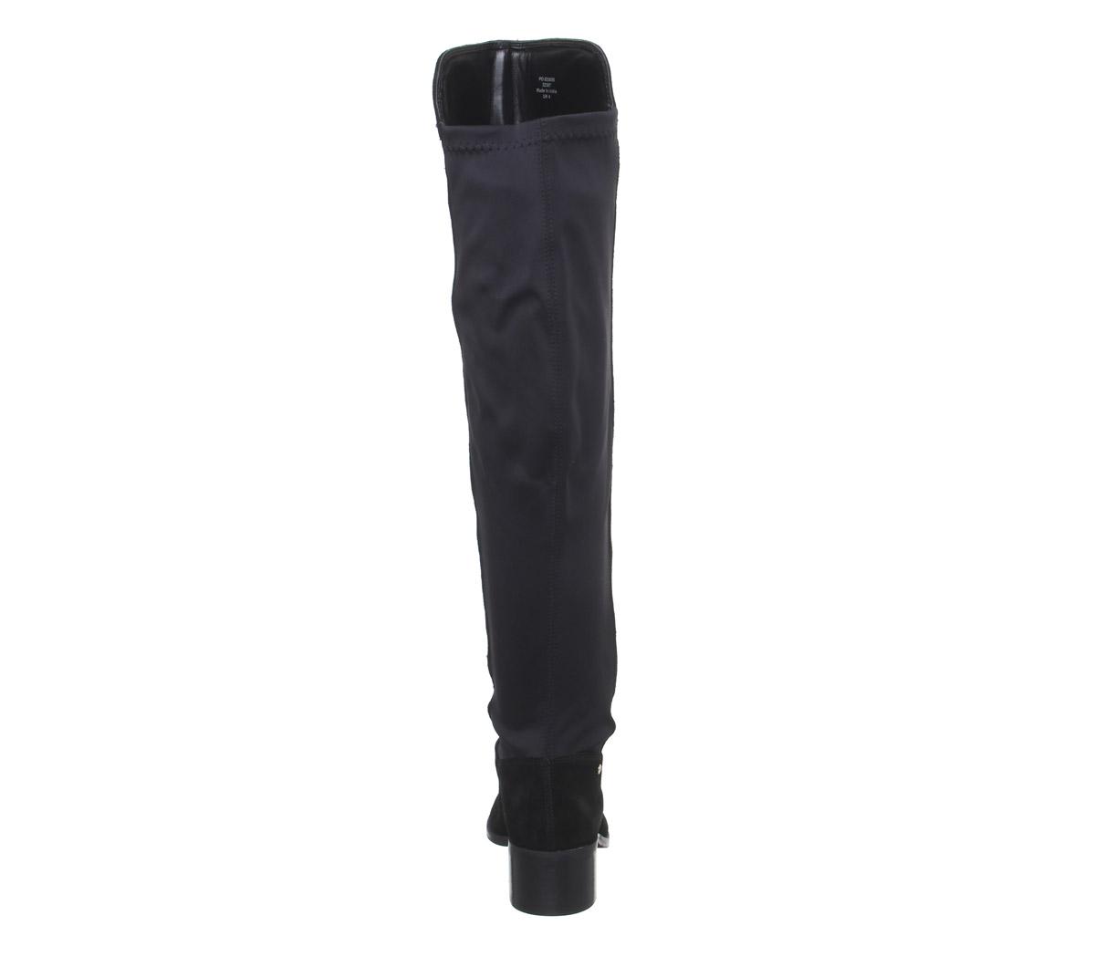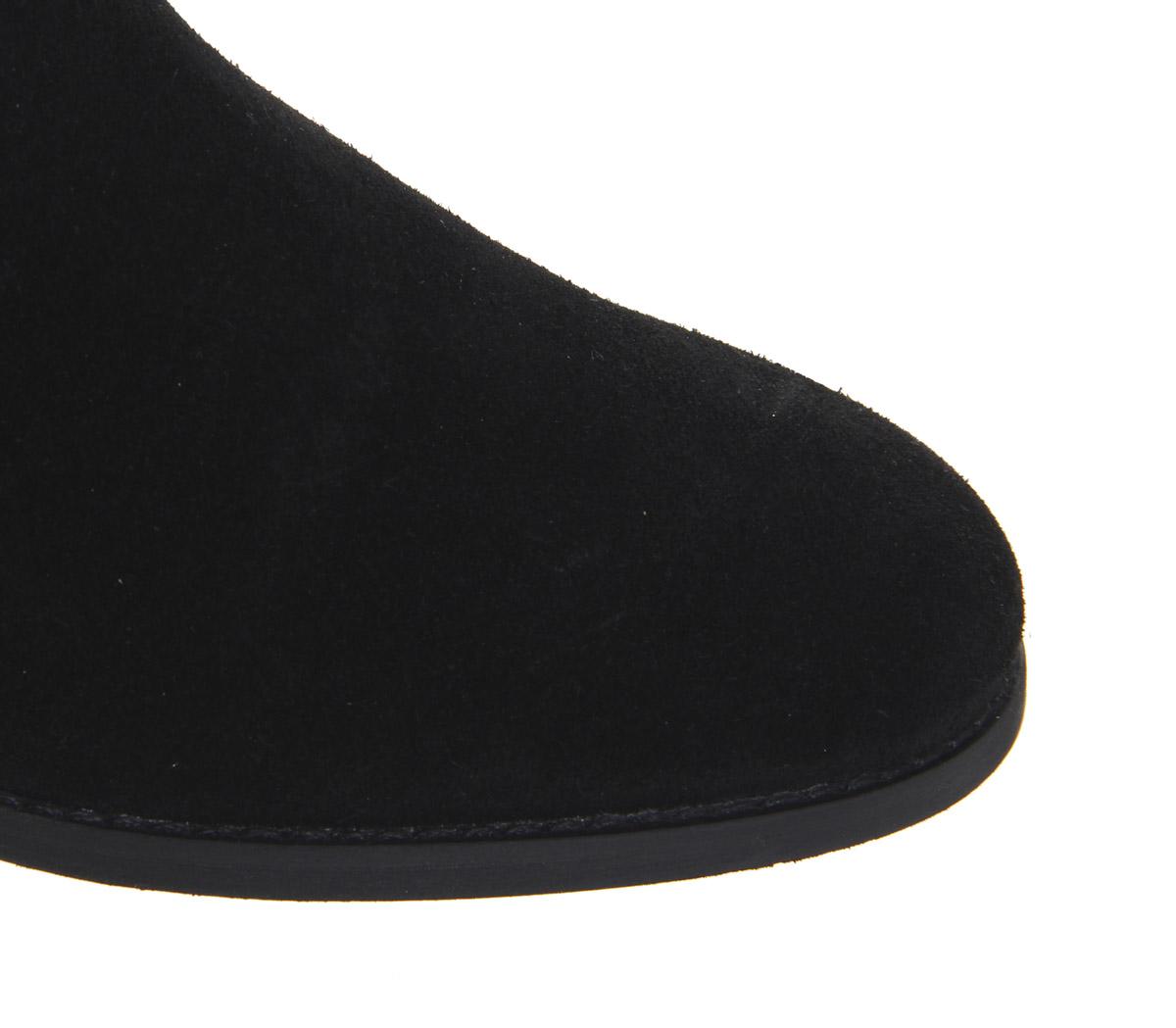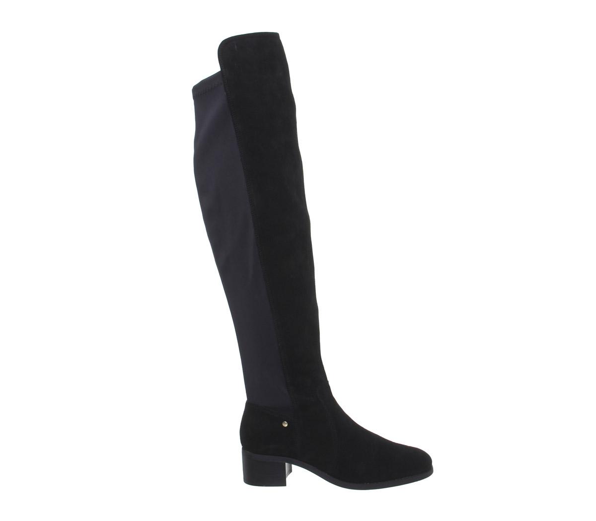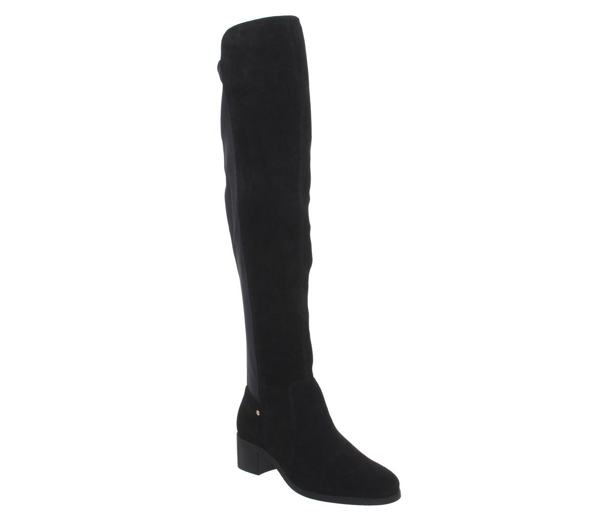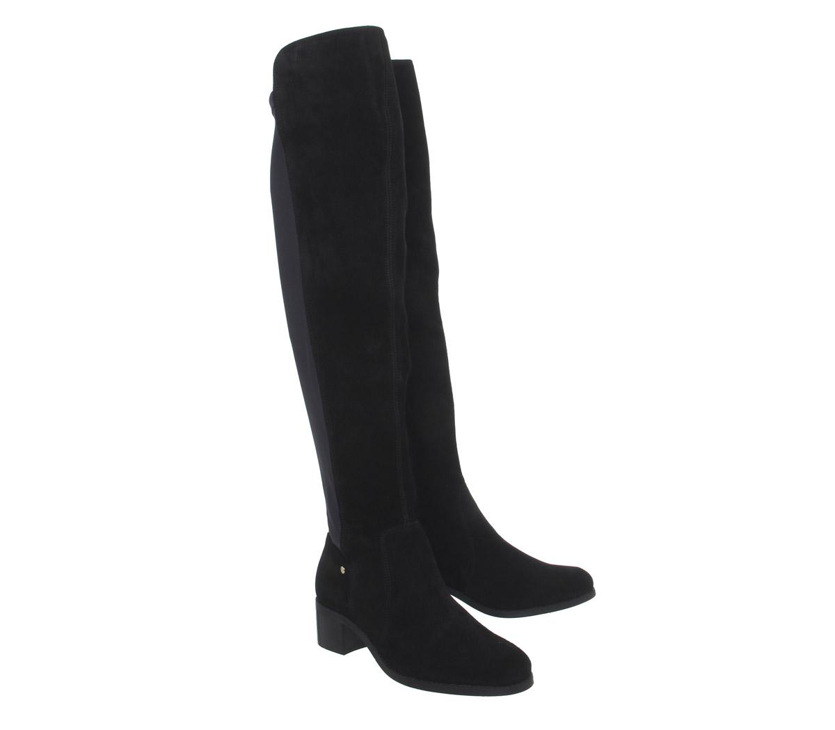 Perfect for dressing up or down, these Kite boots should be in your shoe collection. This iteration features a black suede front and a stretchy textile back panel. Finished with gold stud and short block heel.