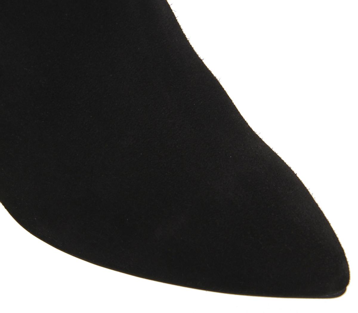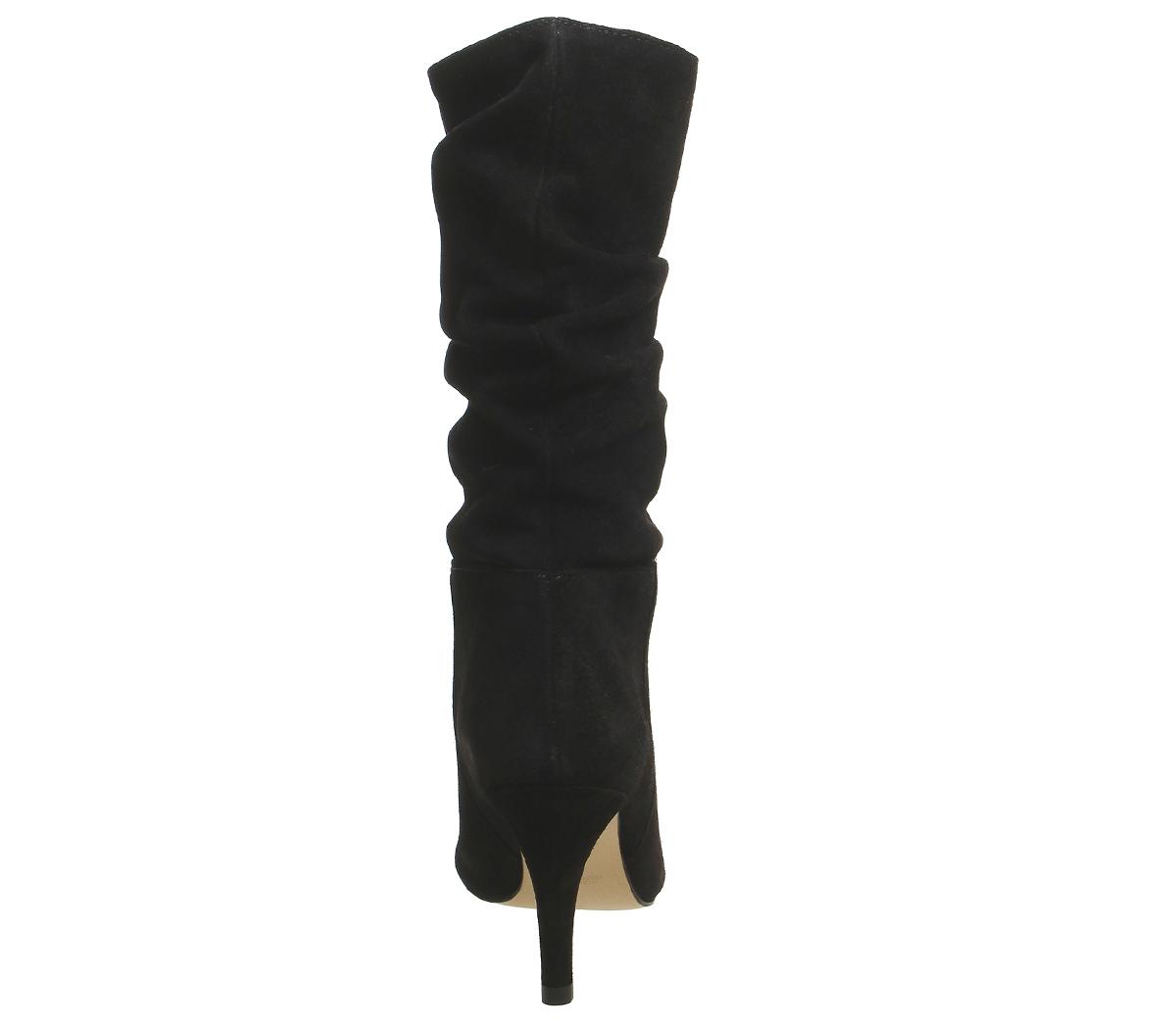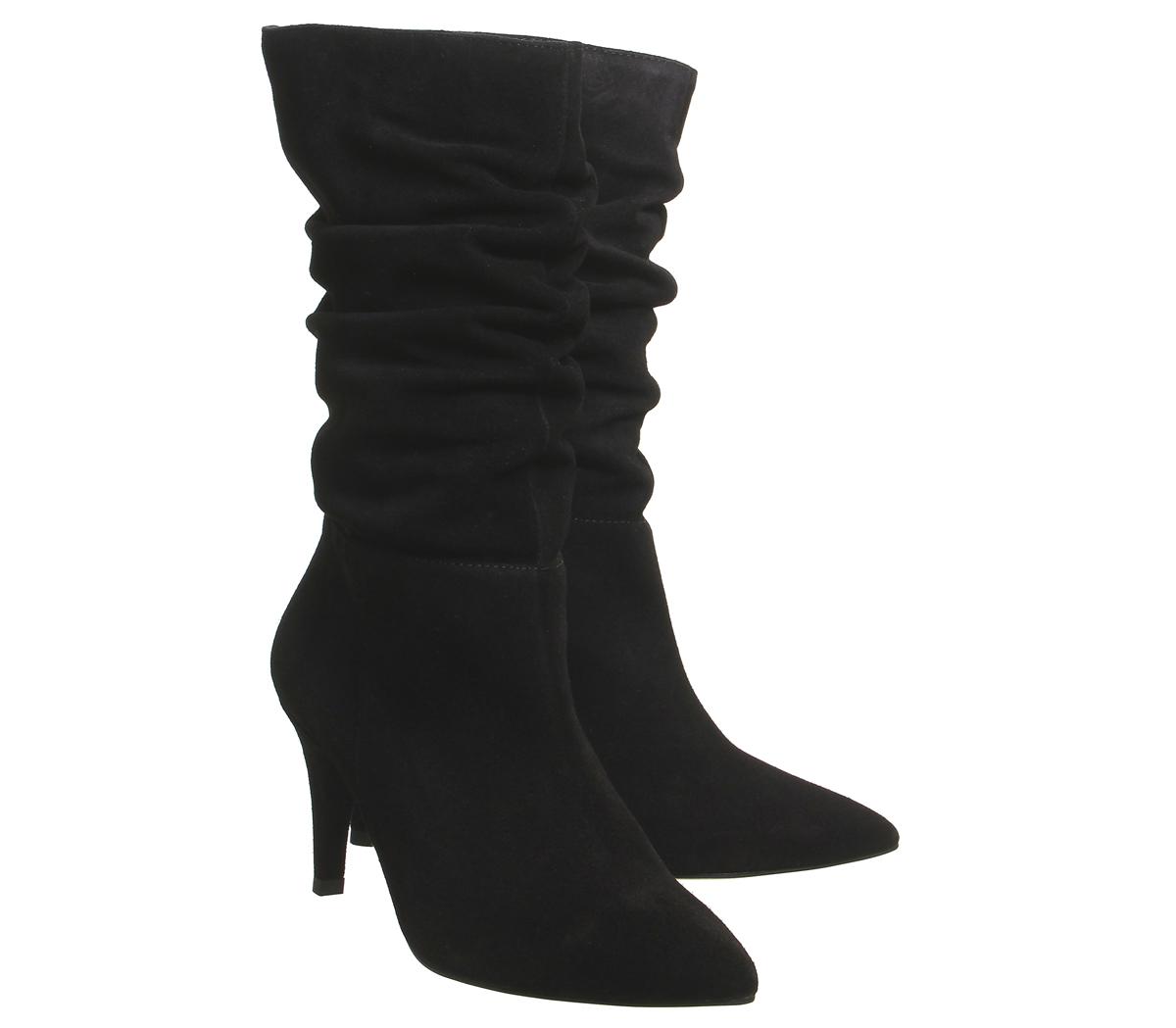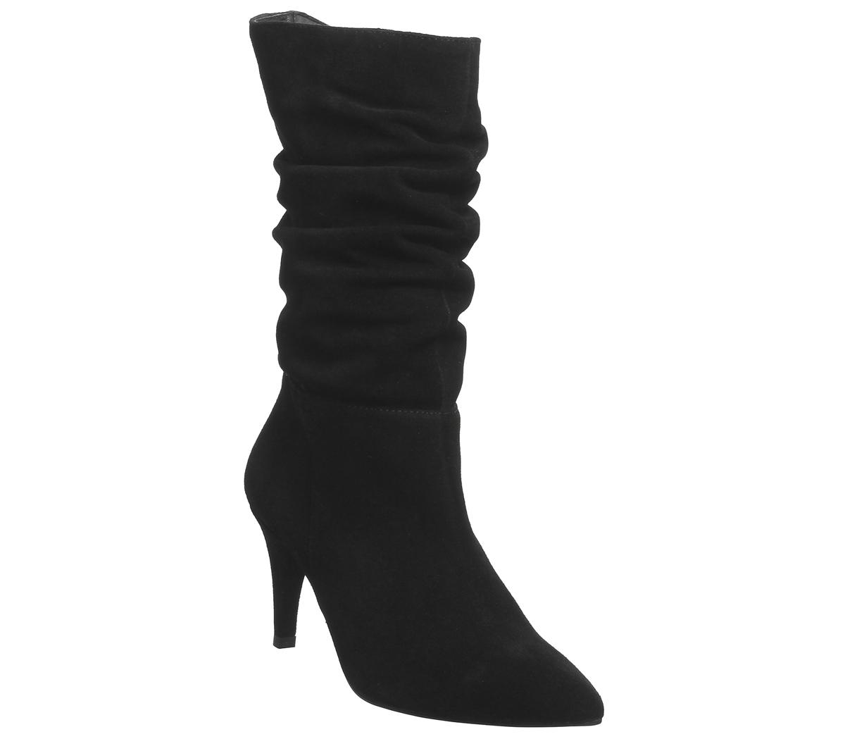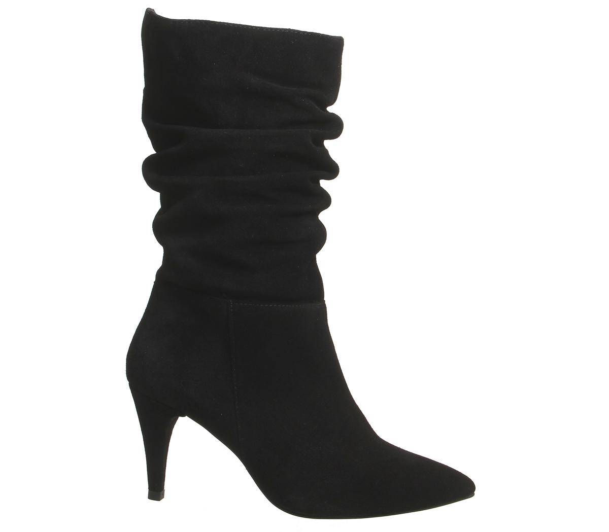 Dressy calf boots featuring a slouched black suede design with a slight heel.