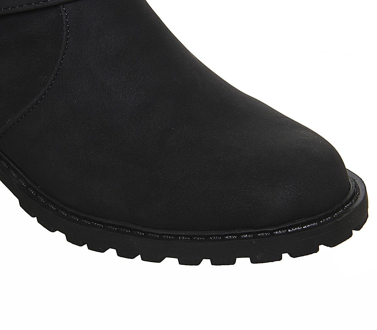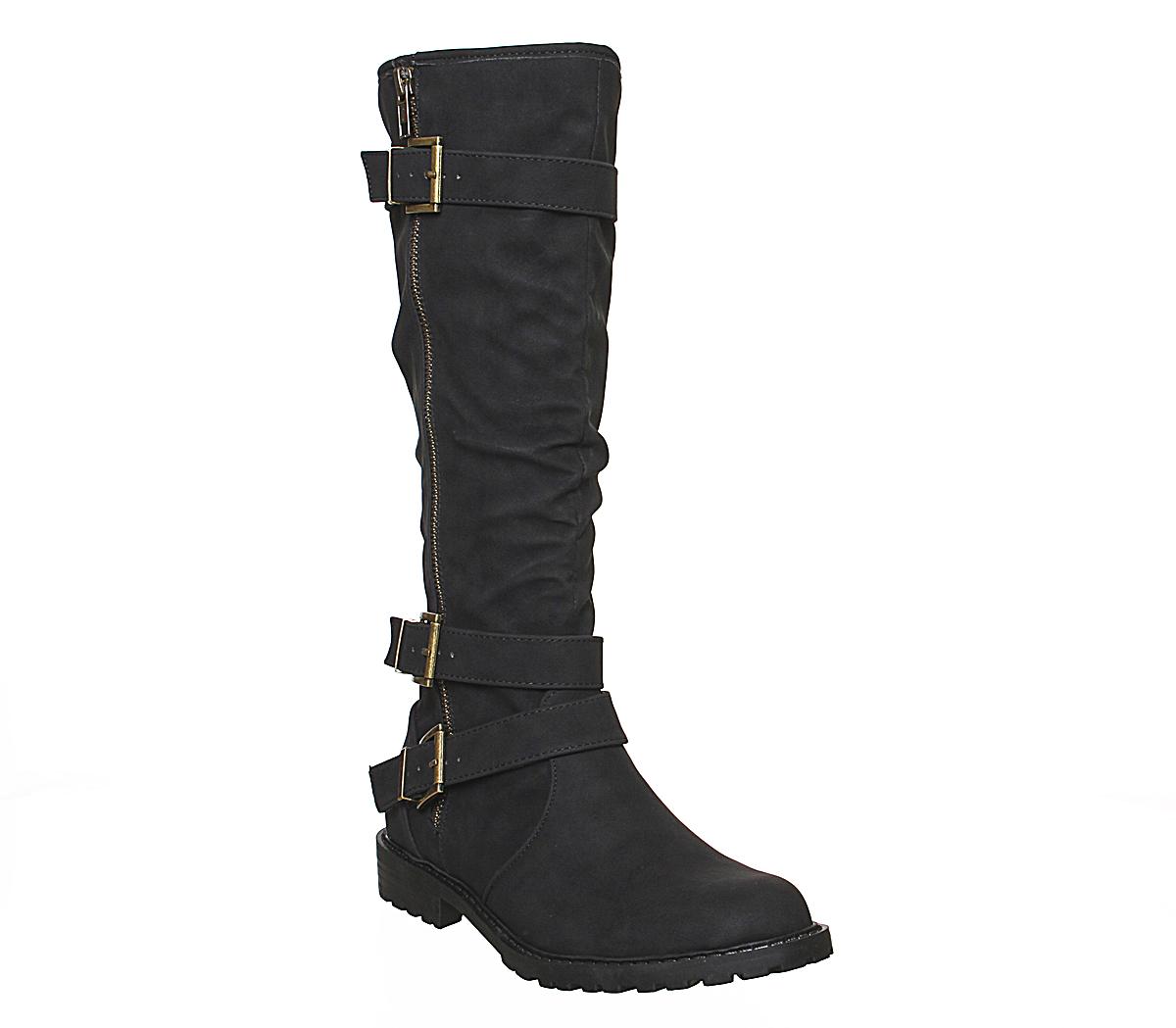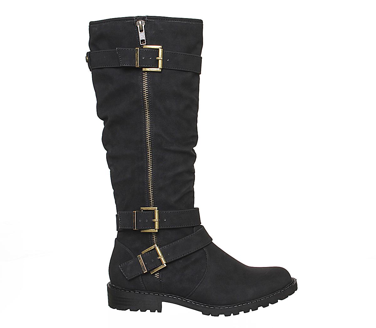 A comfortable knee high boot with stylish buckle and zip detailing. In a black colourway and finished with a inner zip fastening