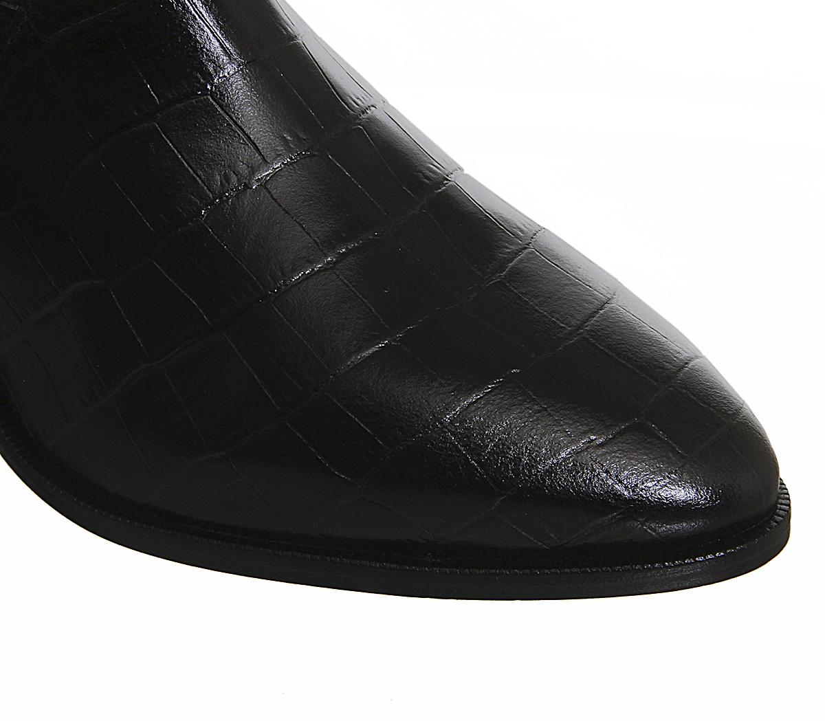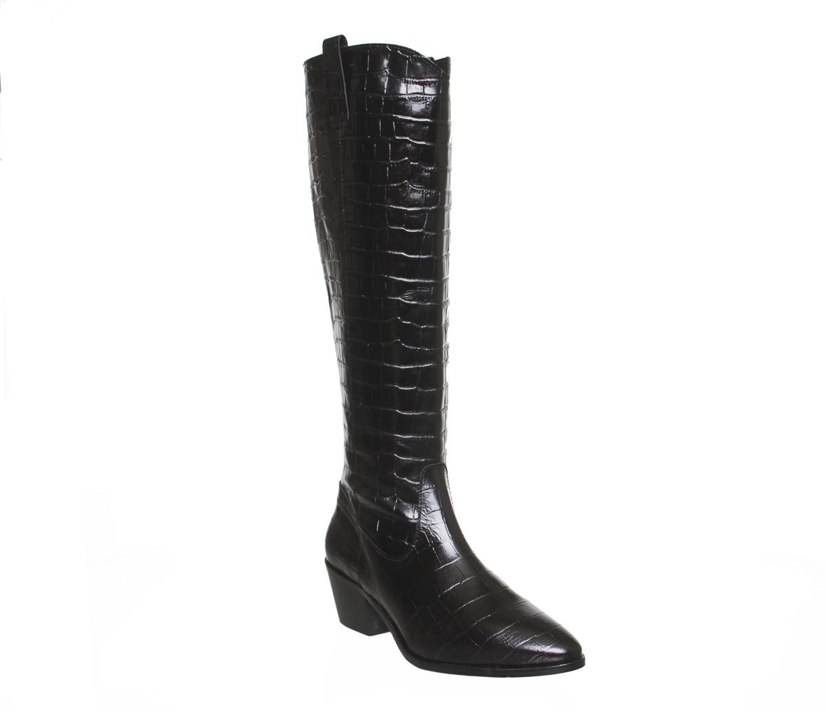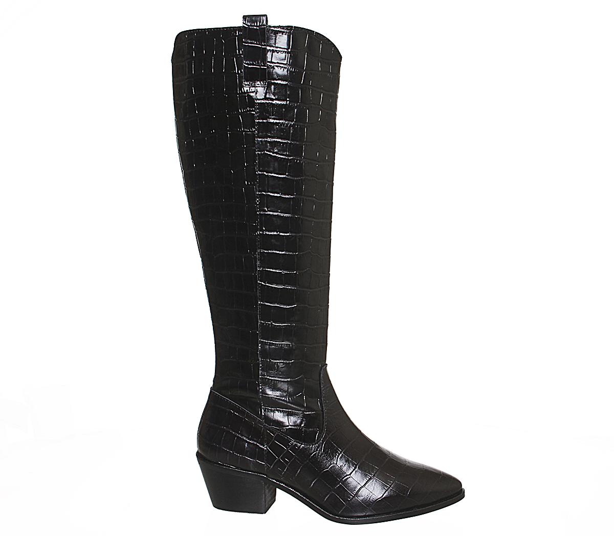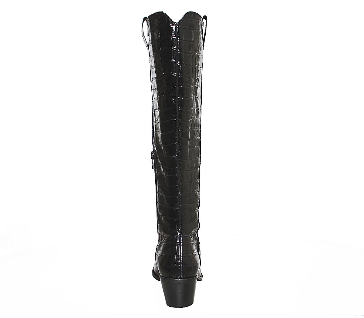 A modern, casual everyday knee high boot with western inspirations. Featuring a beautiful textured croc leather upper and slight chunky heel