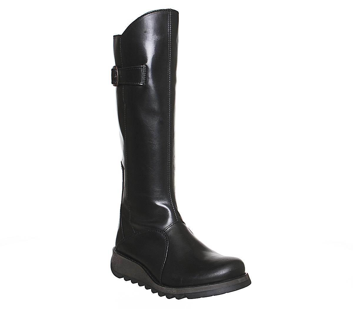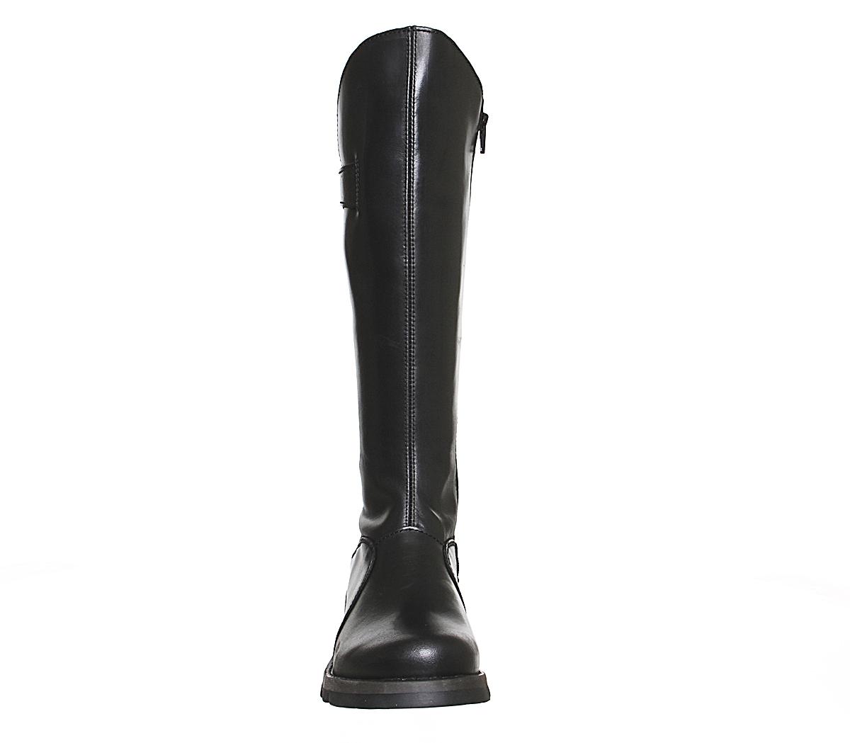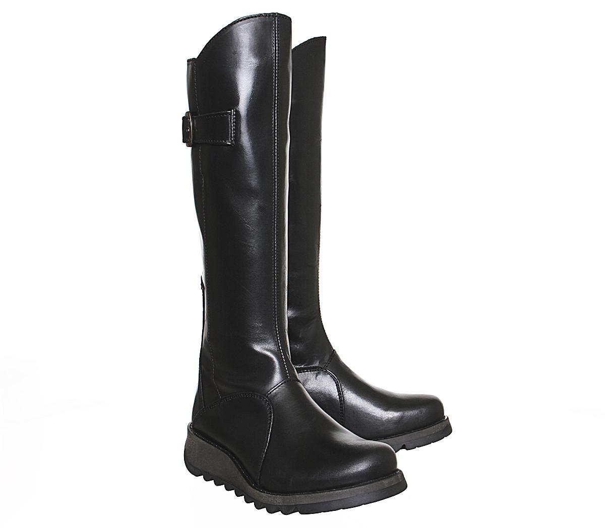 A quality knee high boot featuring sweetheart sides, slight wedge chunky sole and side buckle fastening.