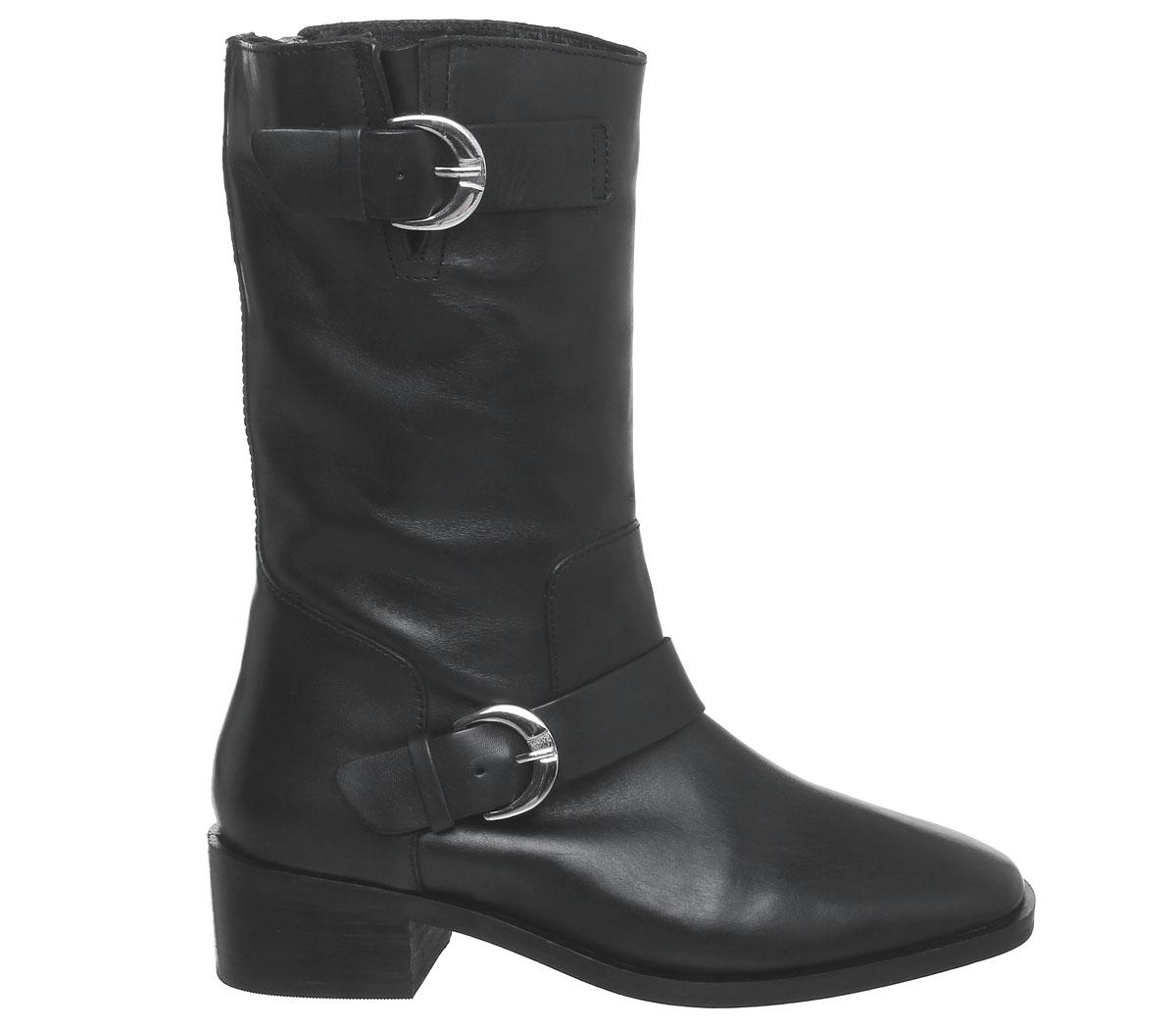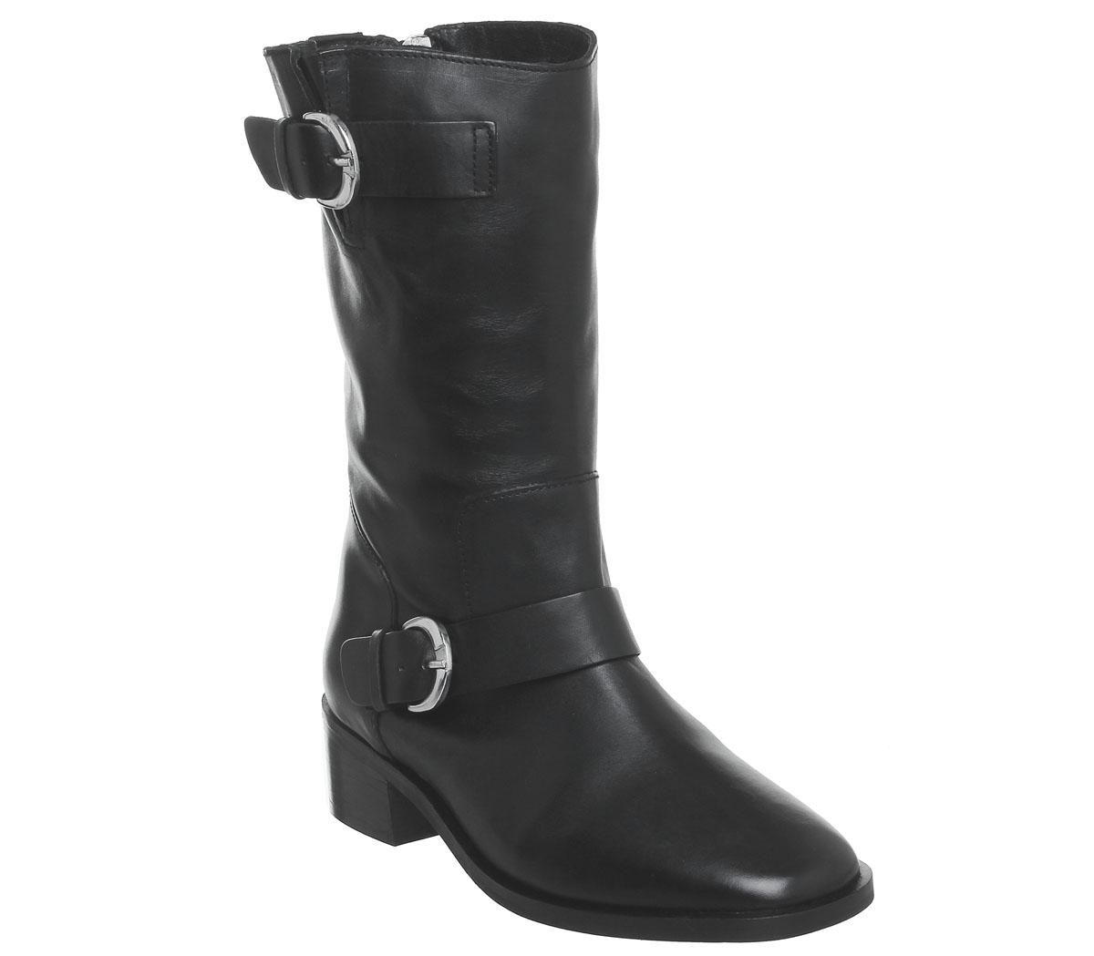 Casual calf high biker boots in a black colourway with feature zip and buckle fastening. These flat boots are a perfect off-duty silhouette.