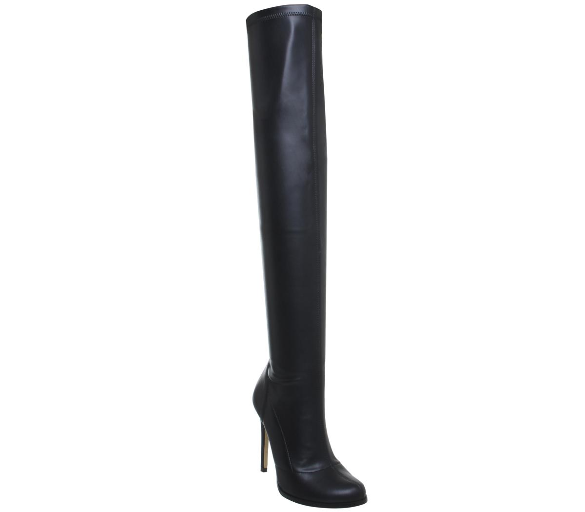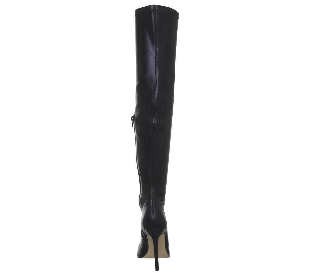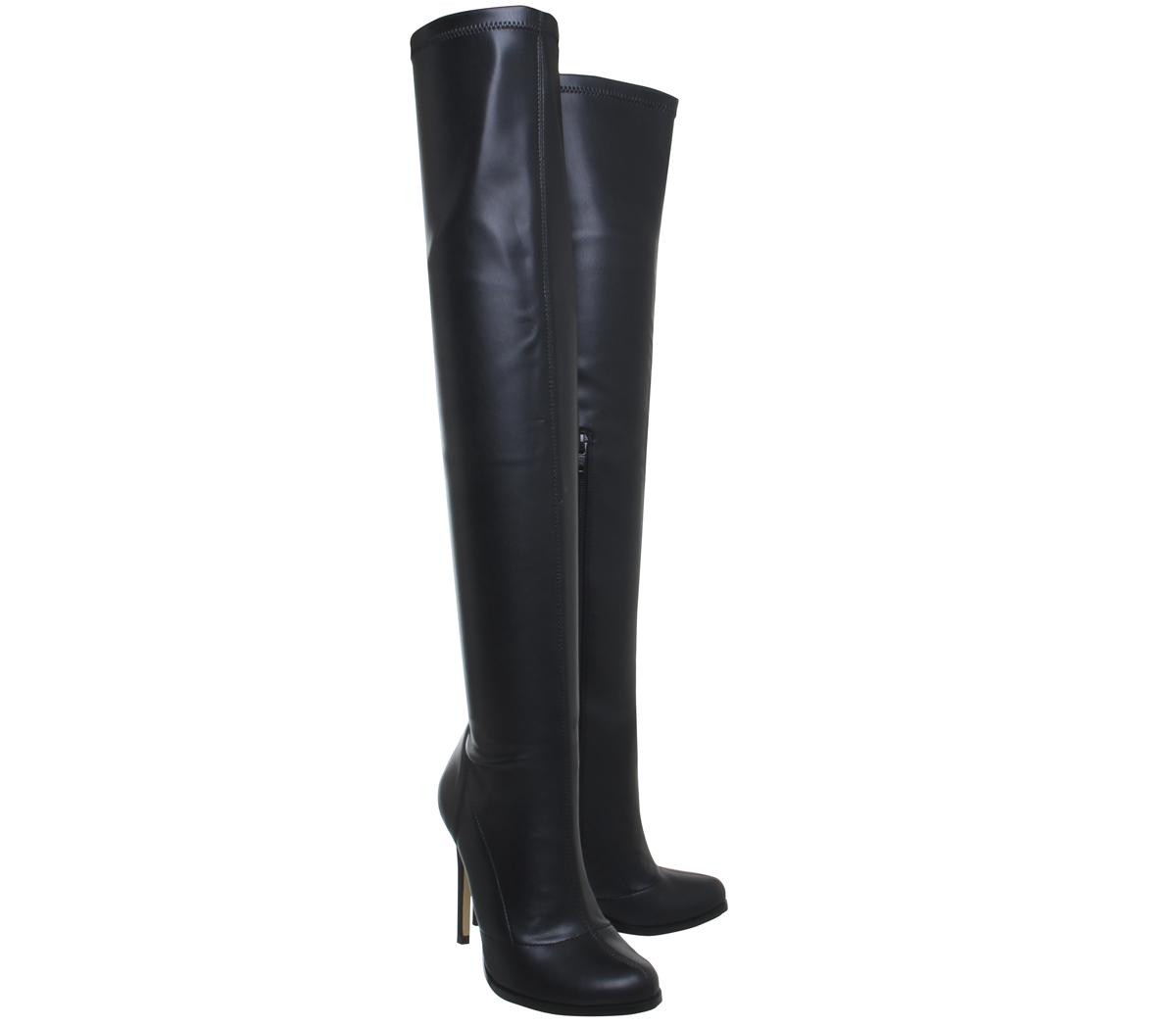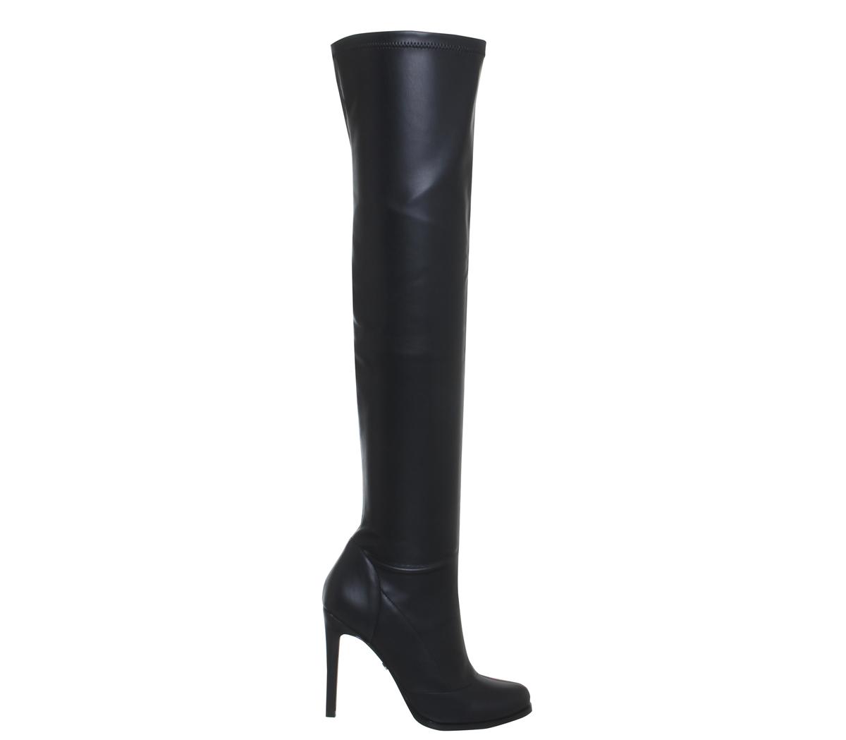 An ultra glam knee high boot to dress up any outfit. Featuring black stretchy material in a over the knee silhouette. Finished with a skinny heel.