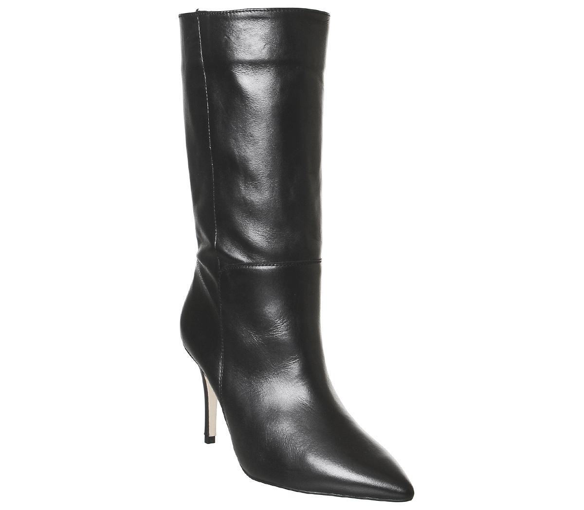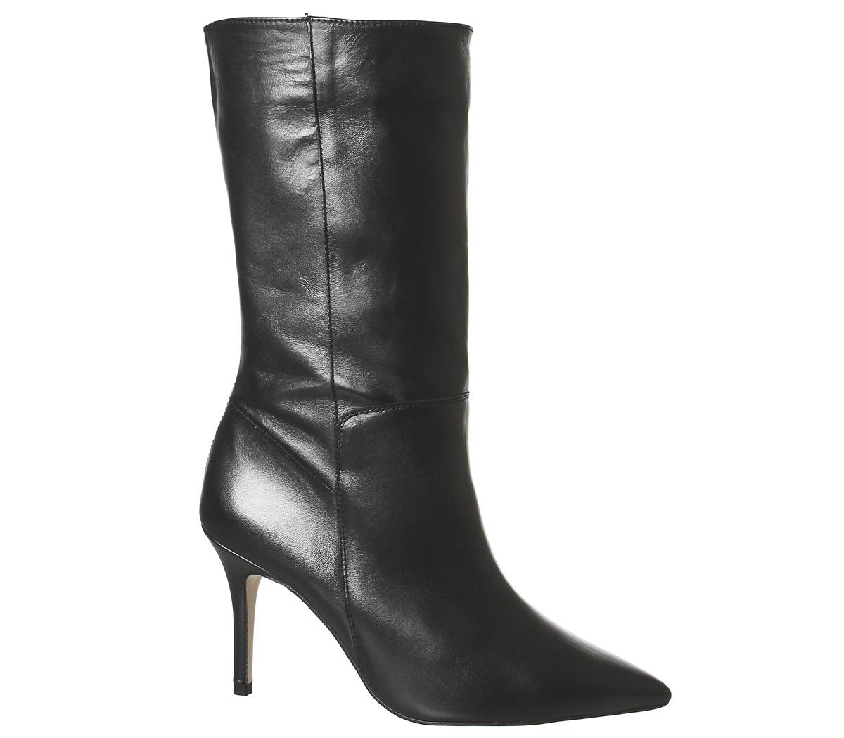 Minimalistic, modern calf length boots. Featuring pointed toe, skinny heel, and wide neck to create that chic silhouette. In a classic black leather