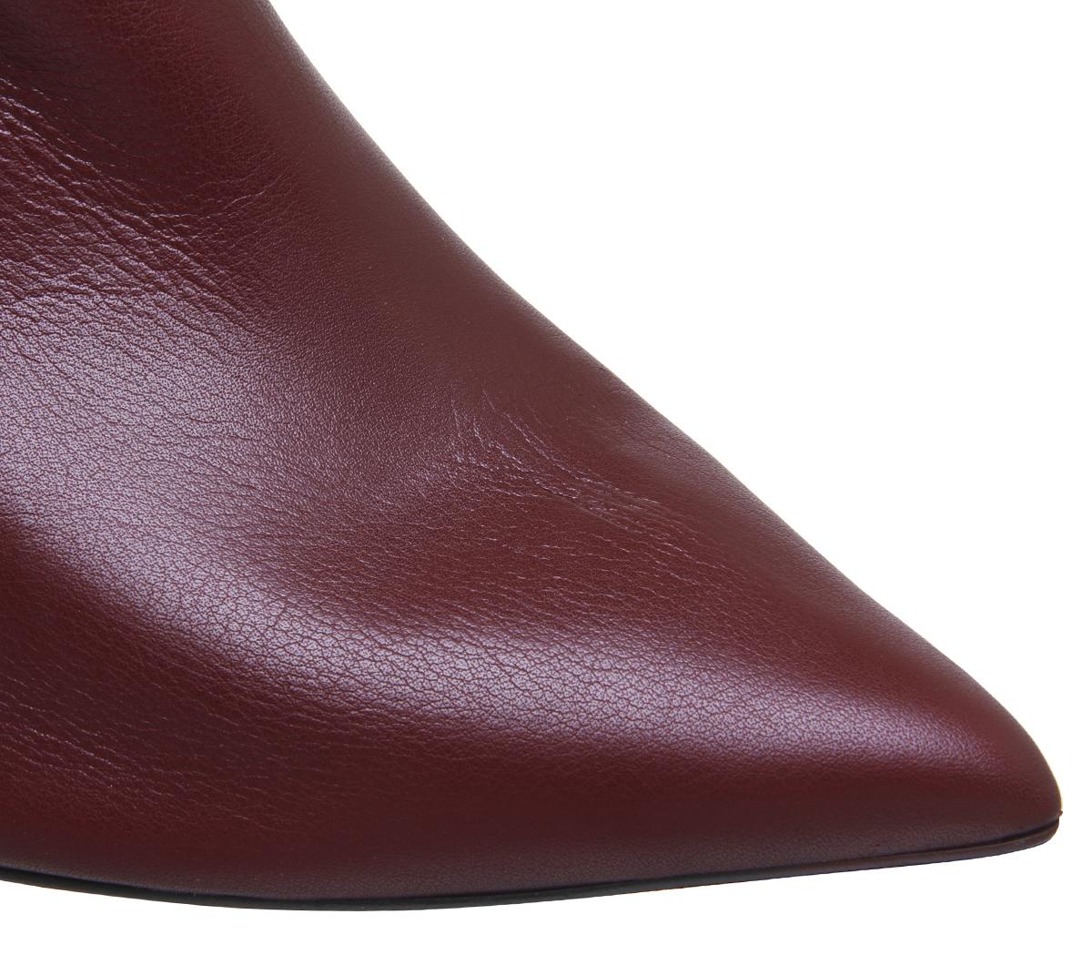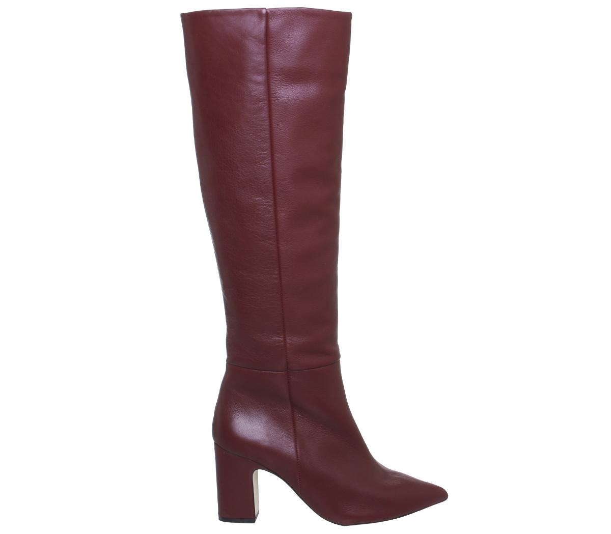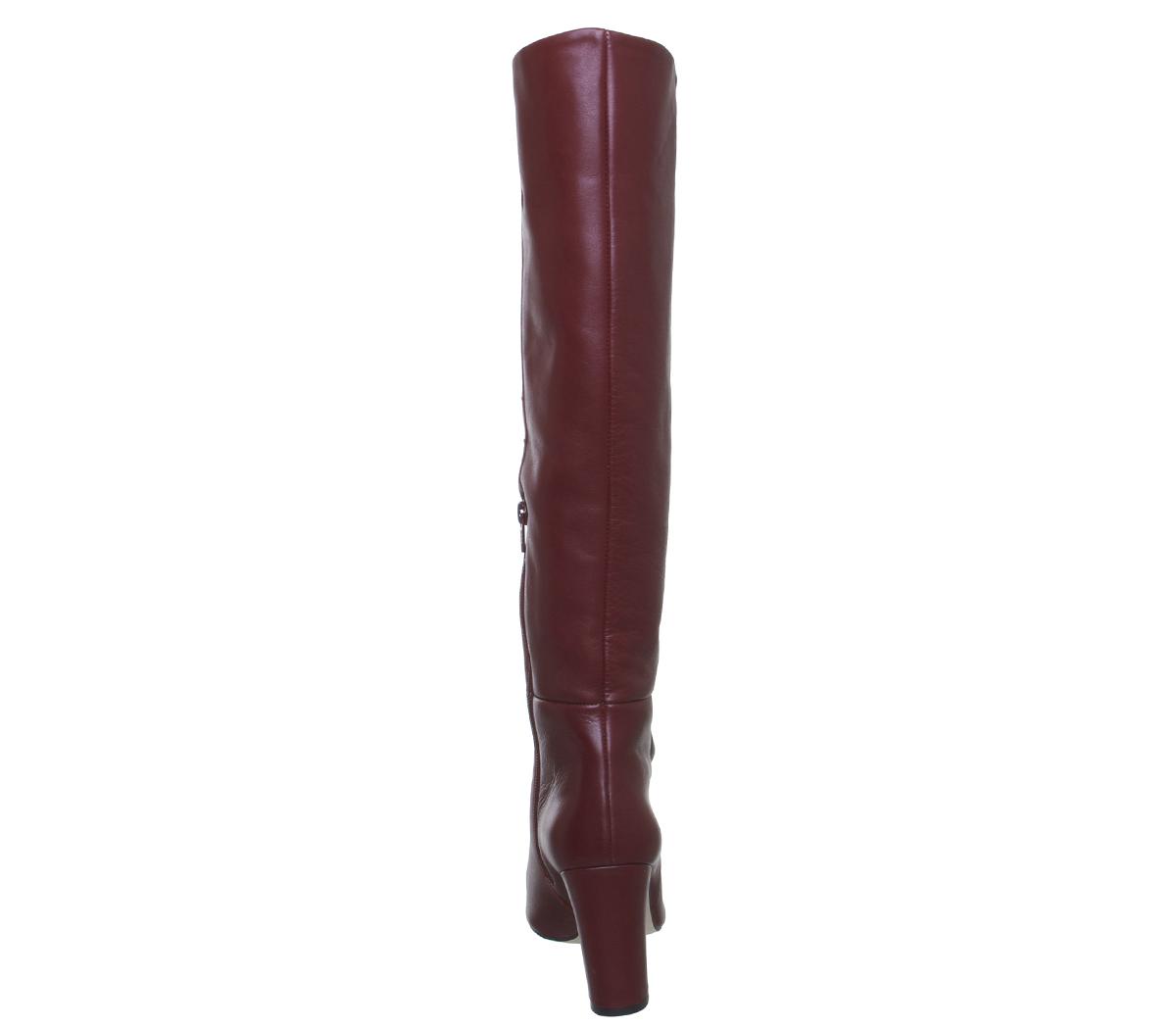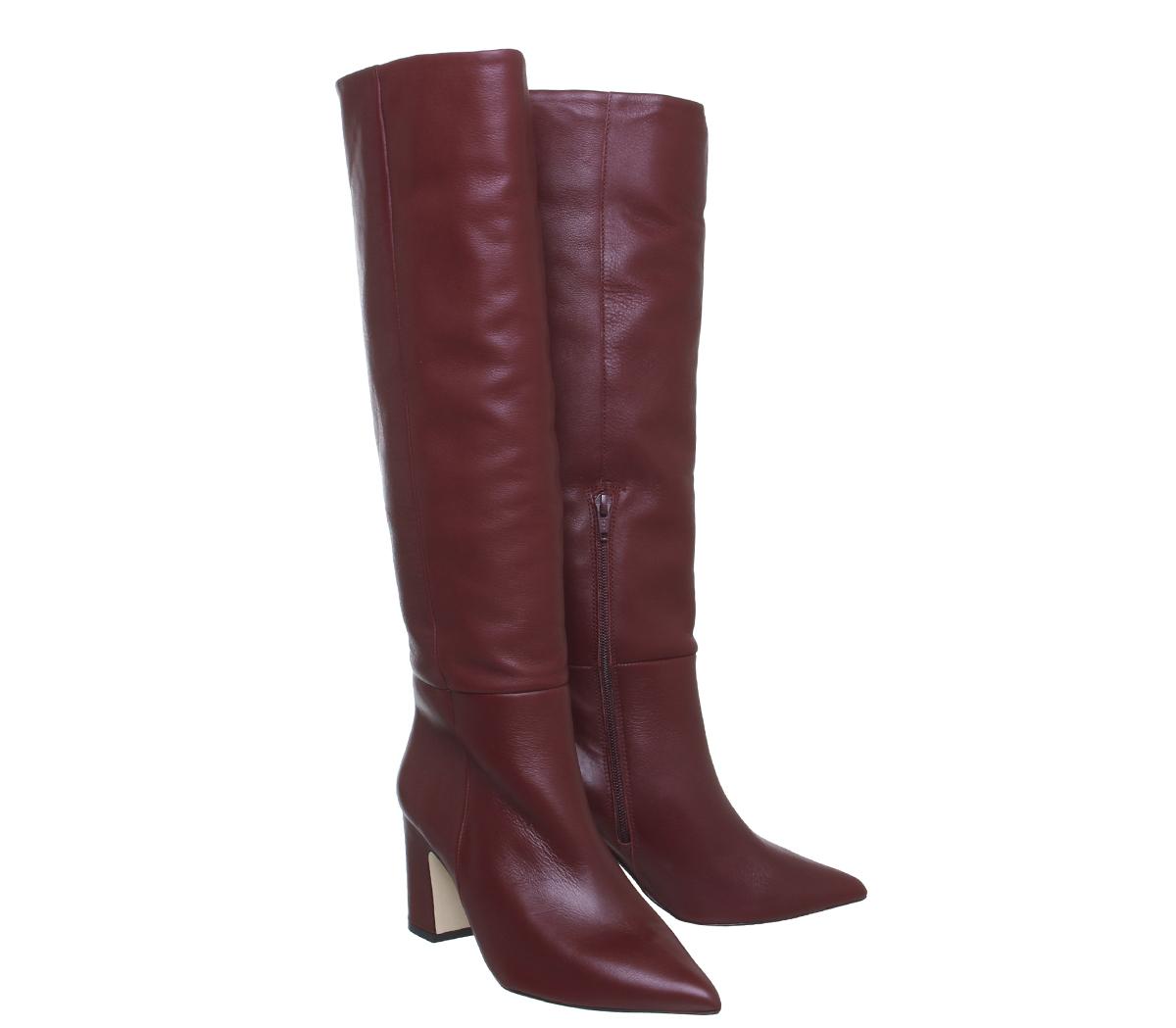 High profile knee high boots with a comfy chunky heel and wider neck. Featuring a burgundy leather upper with a slight ruched effect.