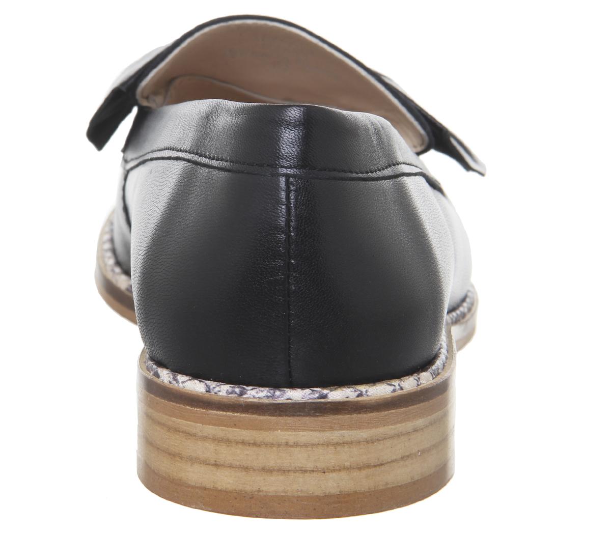 Cute loafers with soft core black  leather uppers and a snake rand detailing.