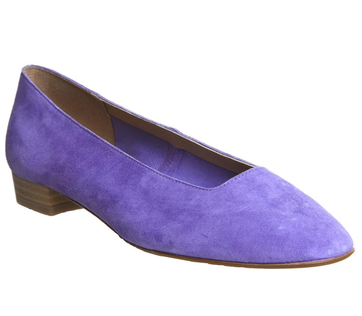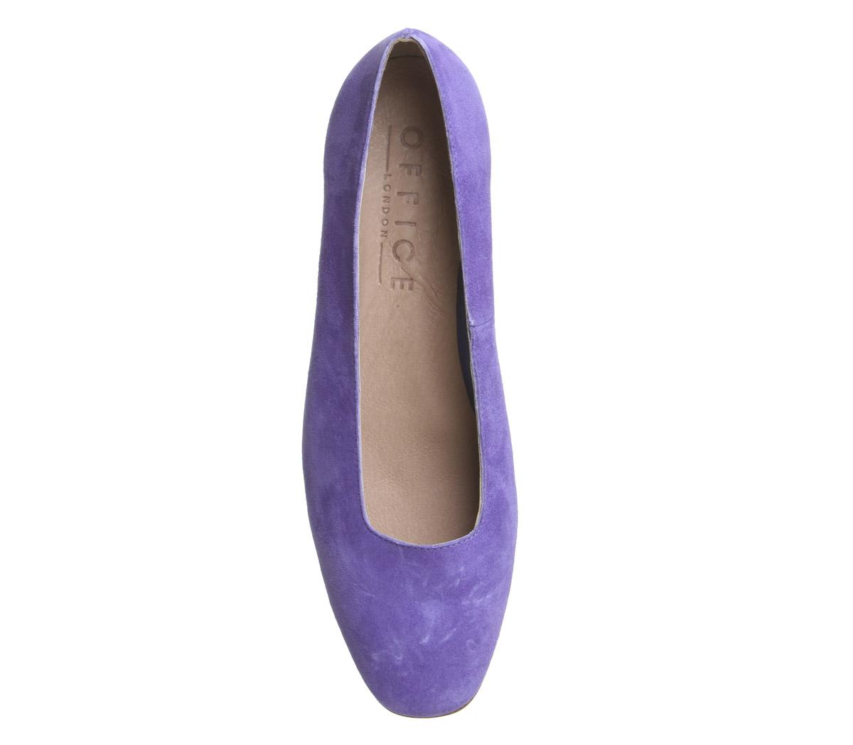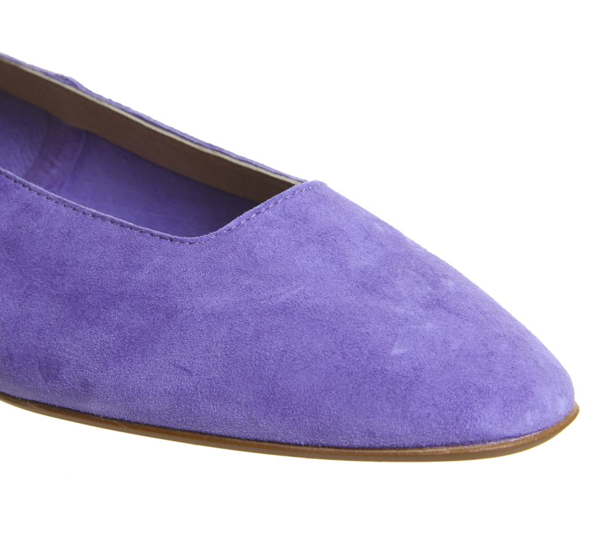 Casual slip-on ballet flats with a fun modern silhouette. Featuring an purple suede upper with square neck design.