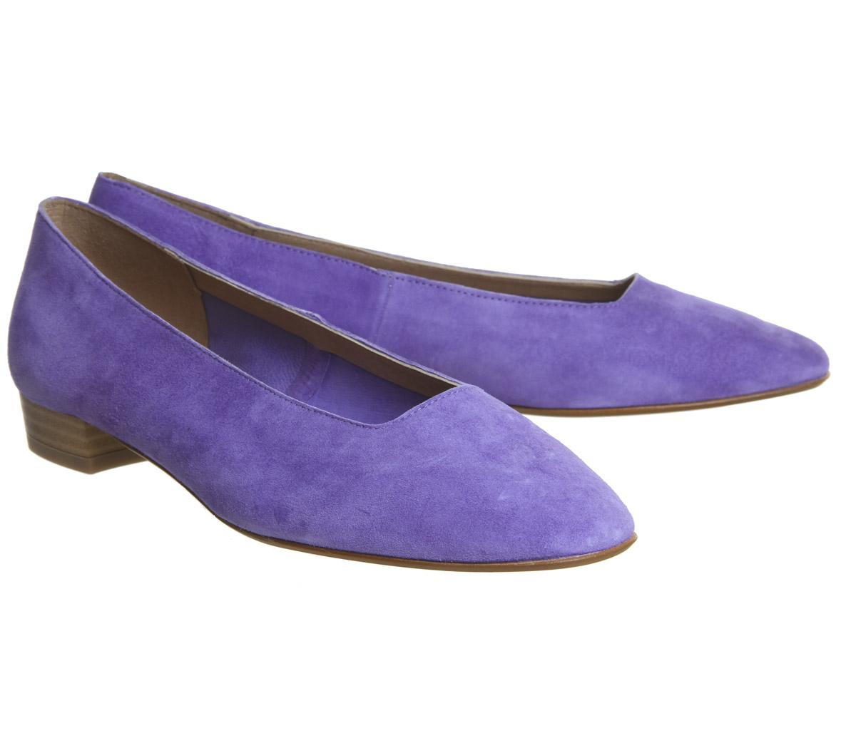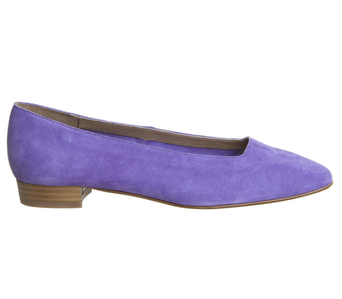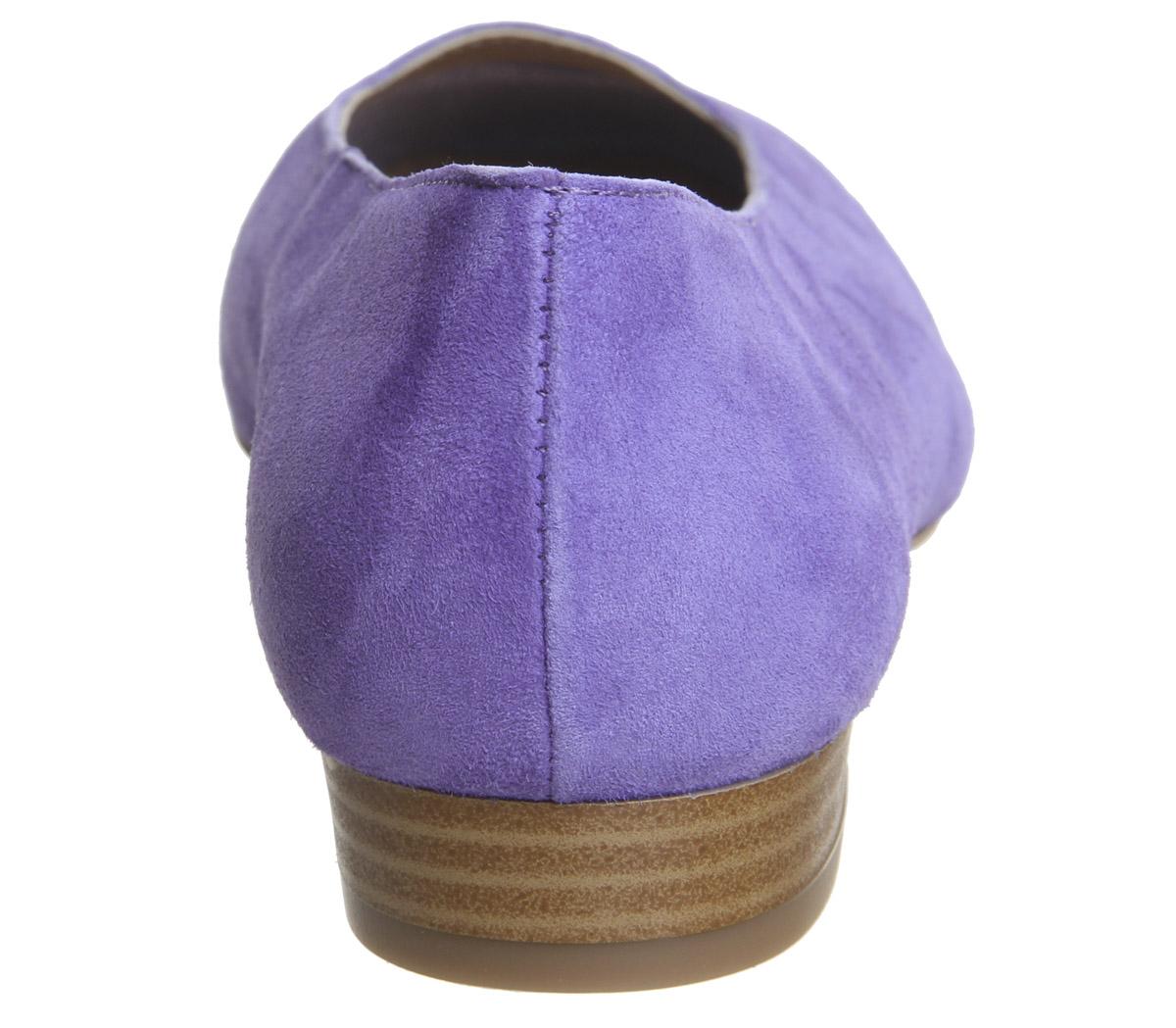Casual slip-on ballet flats with a fun modern silhouette. Featuring an purple suede upper with square neck design.