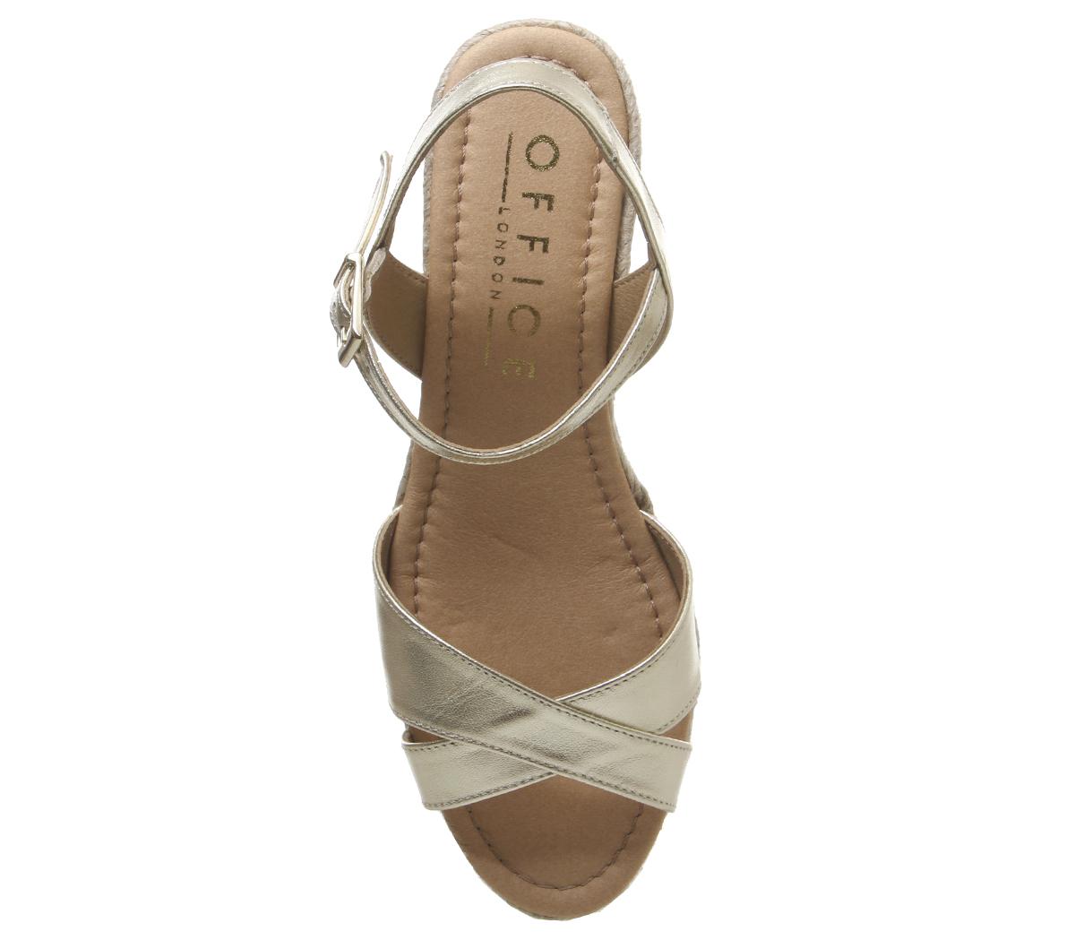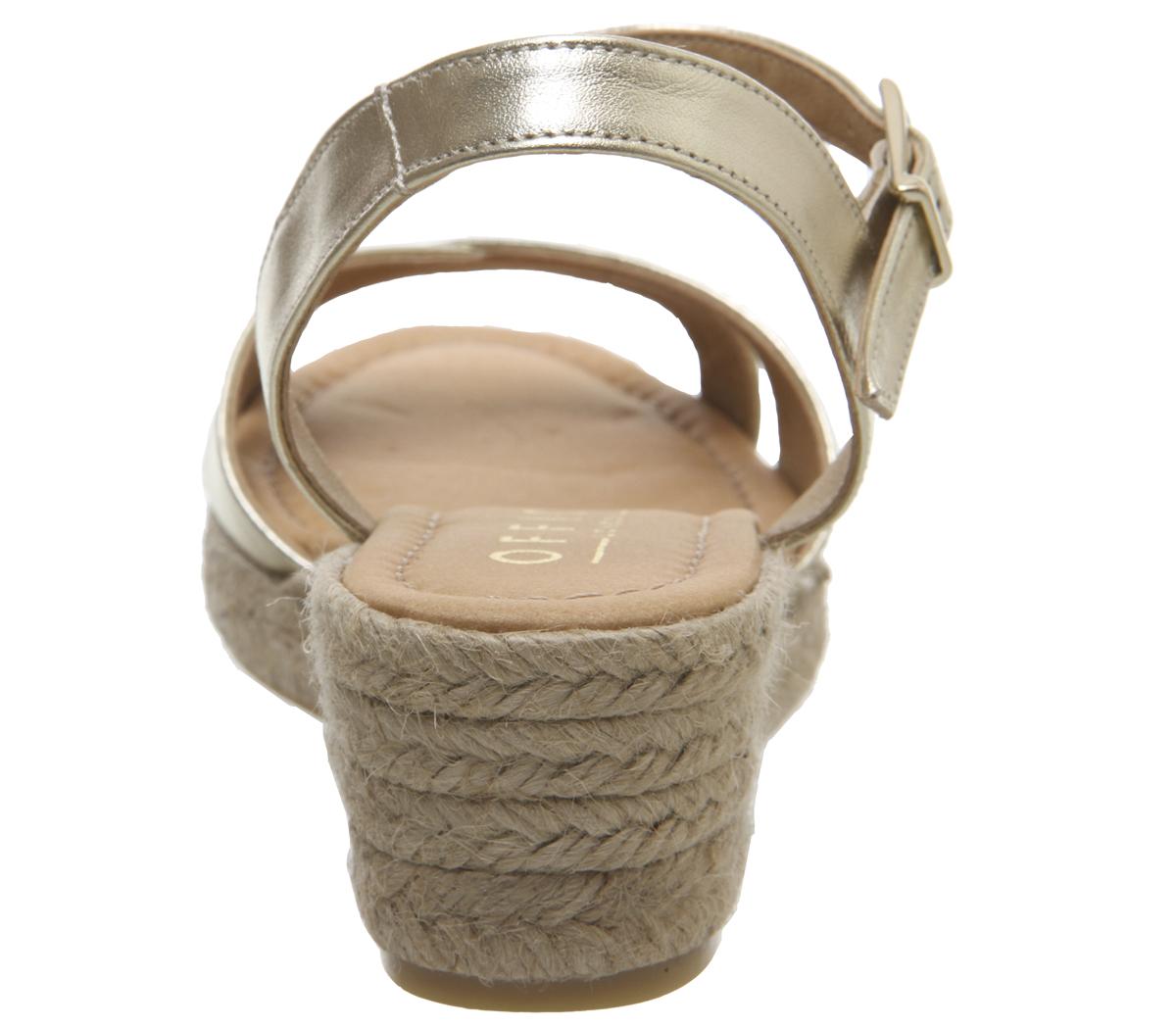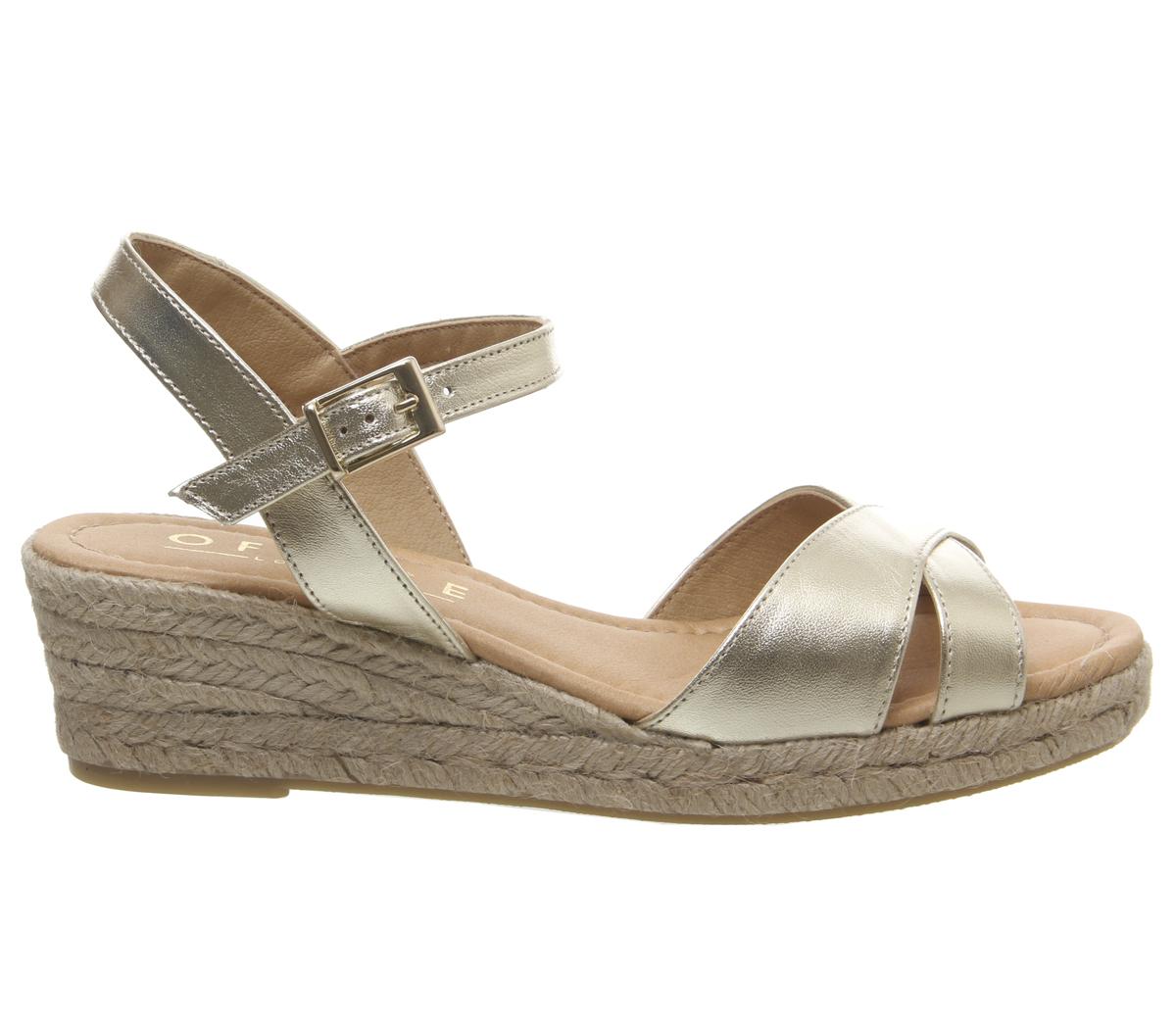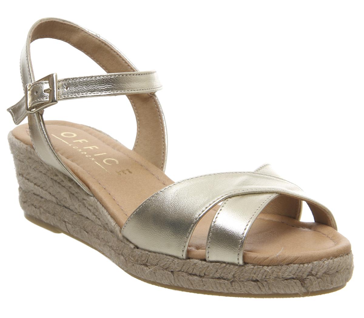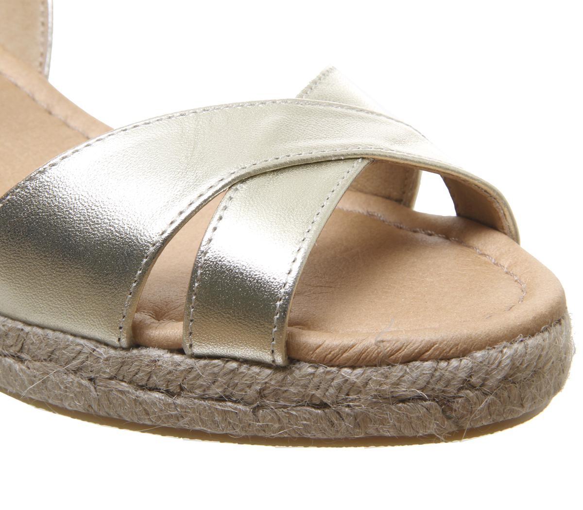 A summer staple featuring a criss-cross leather design with a rope espadrille wedge. Comfortable and stylish in a gold colourway