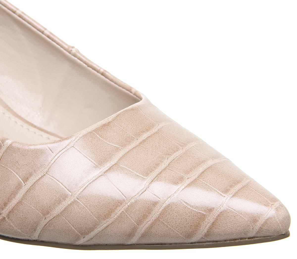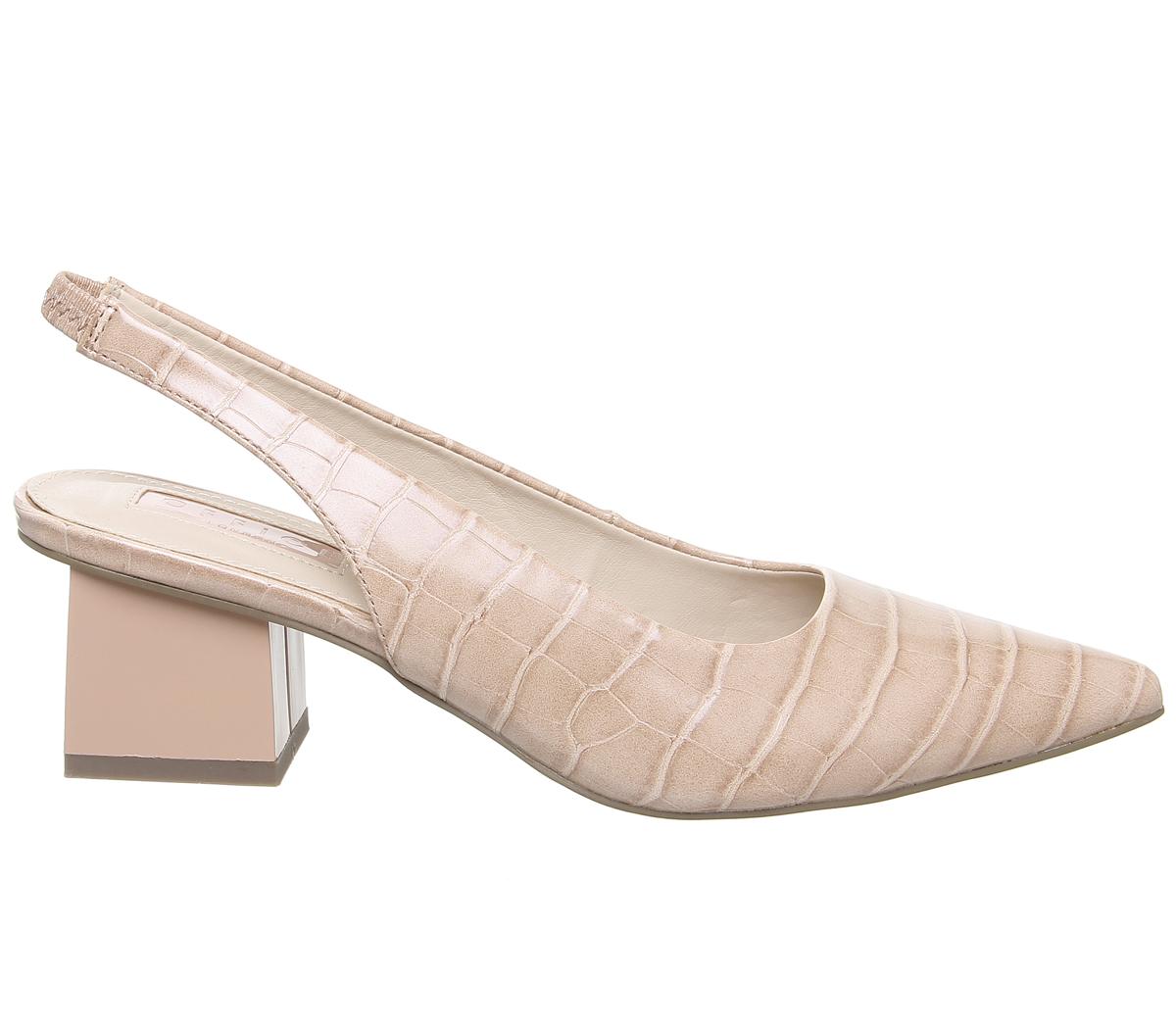 Modern mid heels with a sophisicated nude touch. Featuring a croc effect upper, block heel and slingback fastening