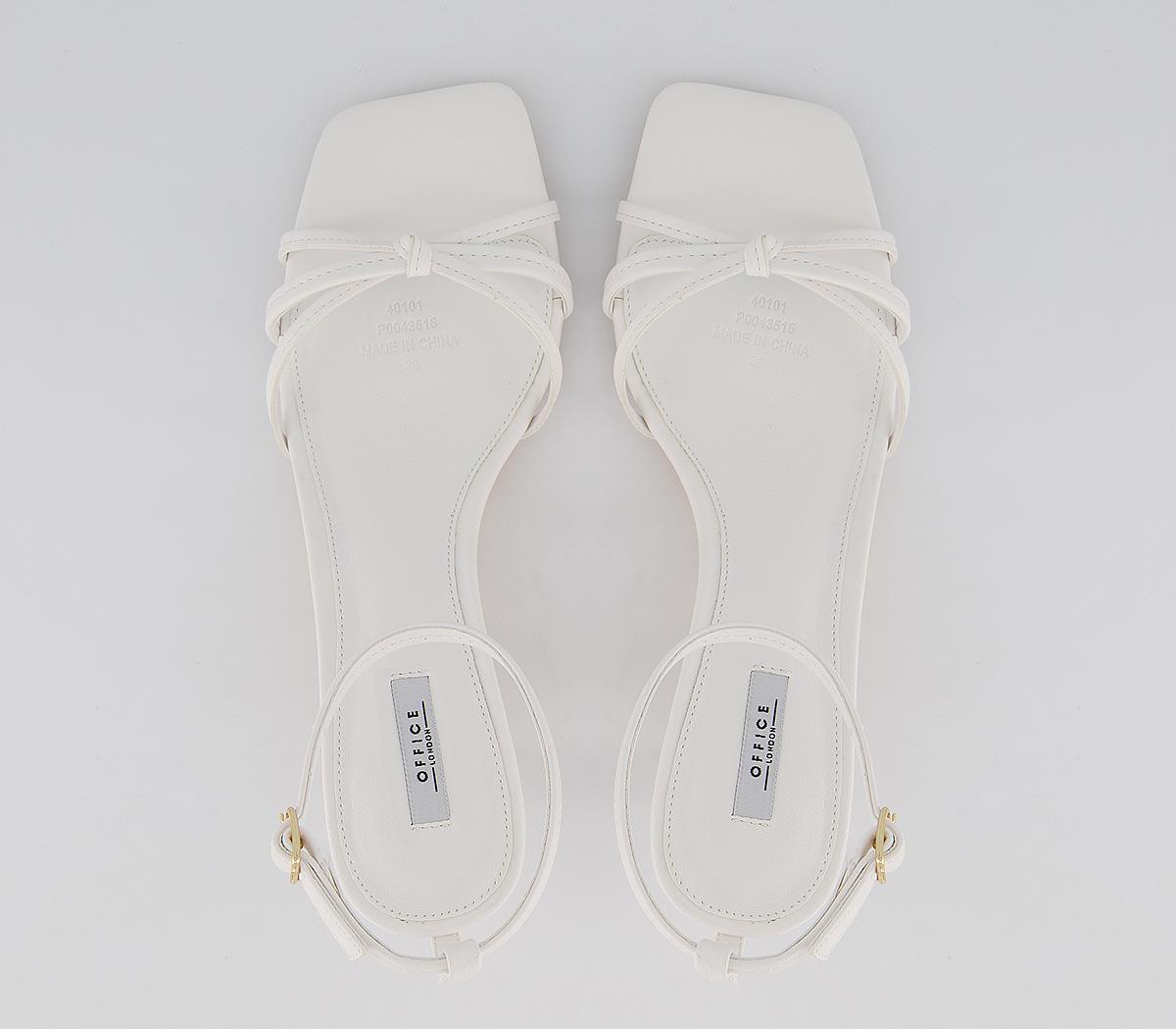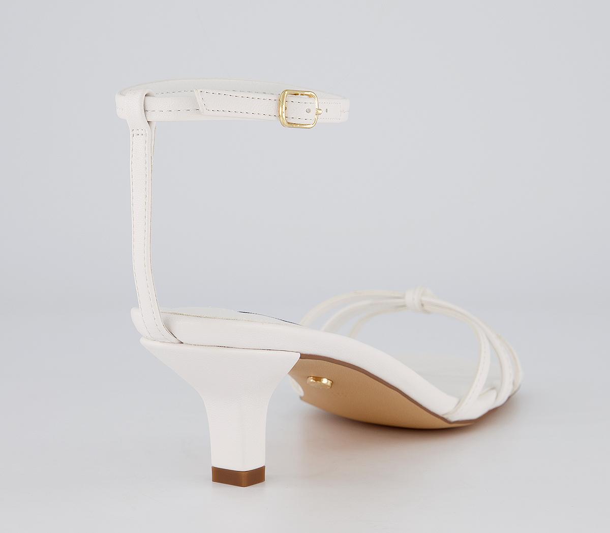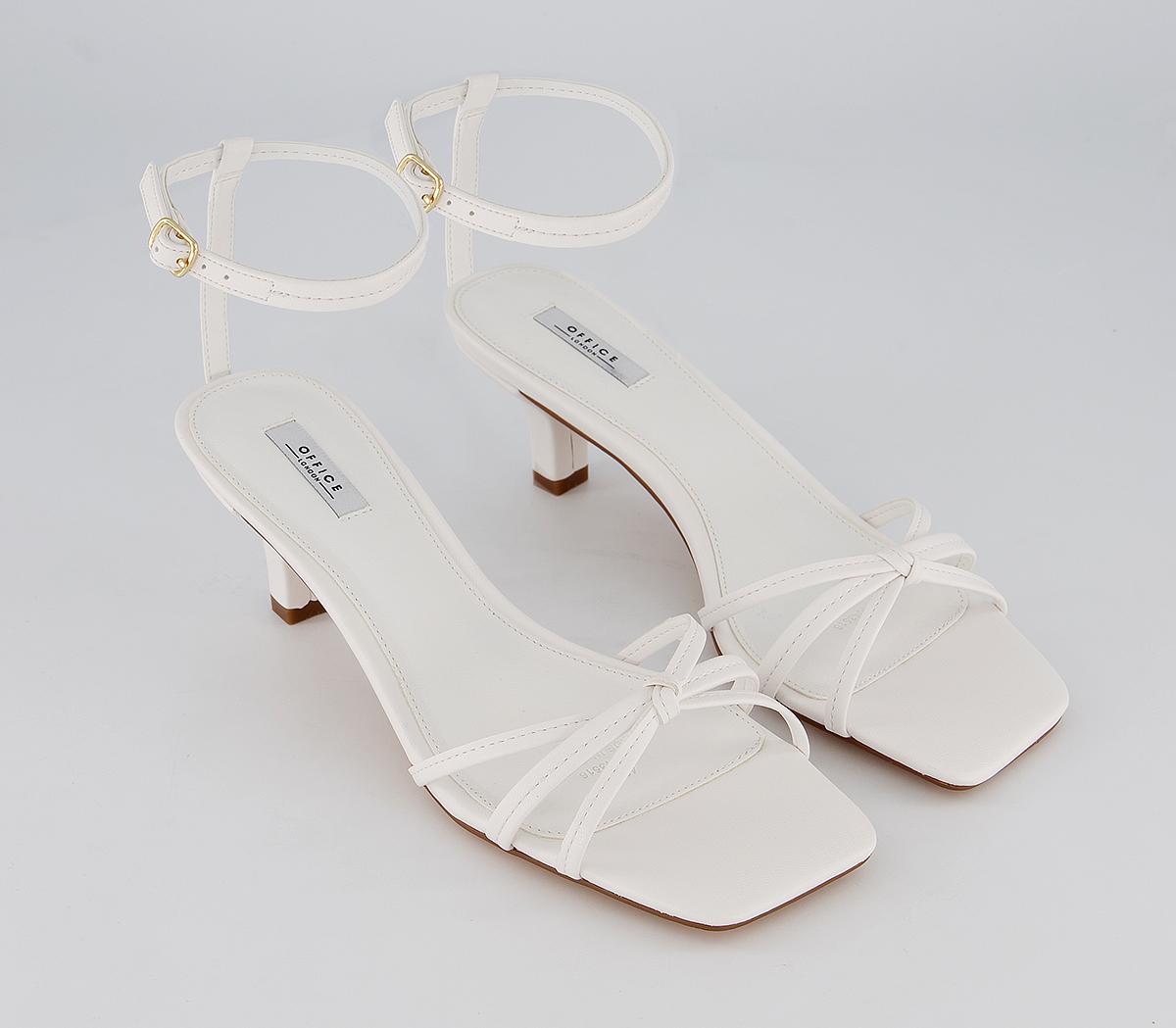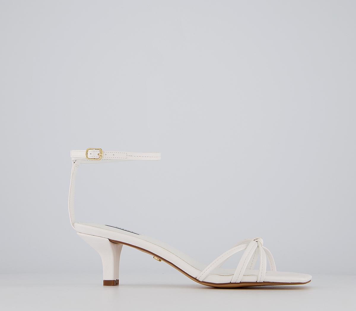 These midheels feature a delicate heel, square toe, knotted toe strap and an buckled ankle strap. This iteration comes in white.