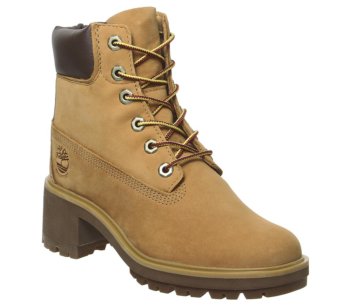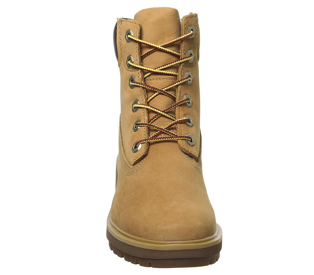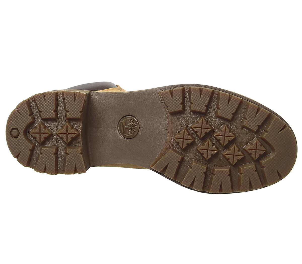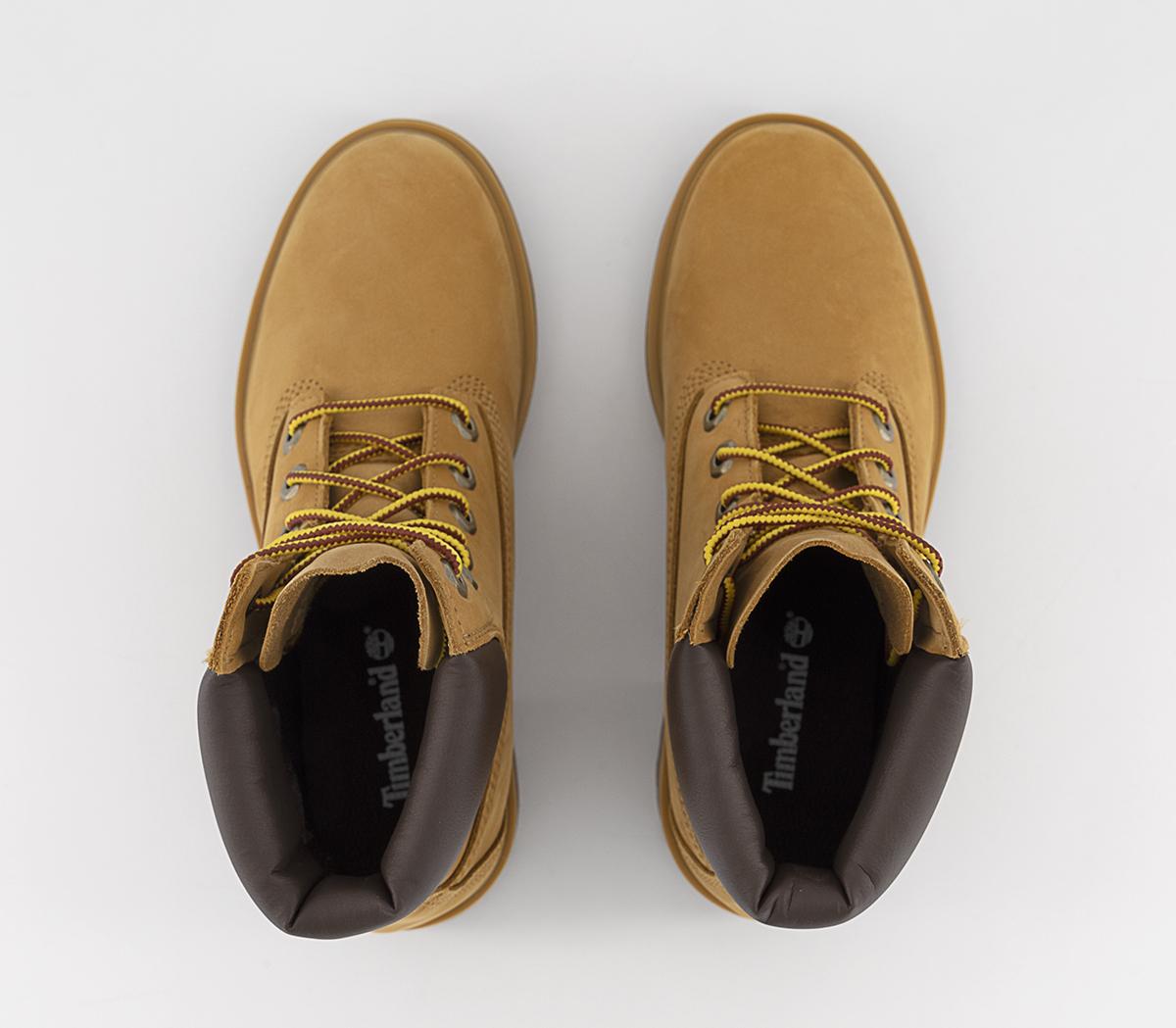 A great everyday waterproof boot with a premium treated nubuck upper. Elevating the classic Timberland boot with a heeled chunky cleated rubber sole, embossed brand detailing and a padded collar. In a wheat colourway