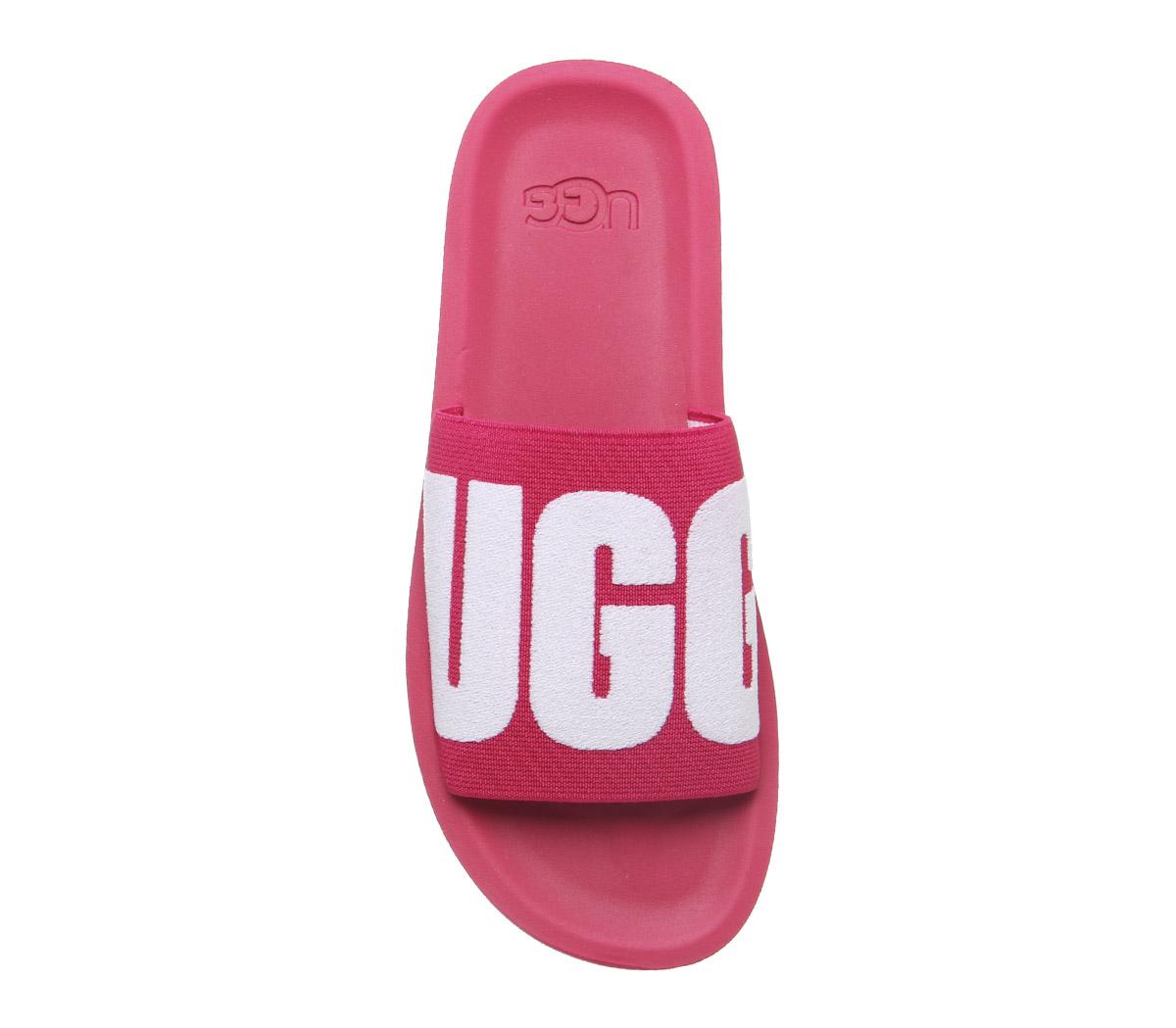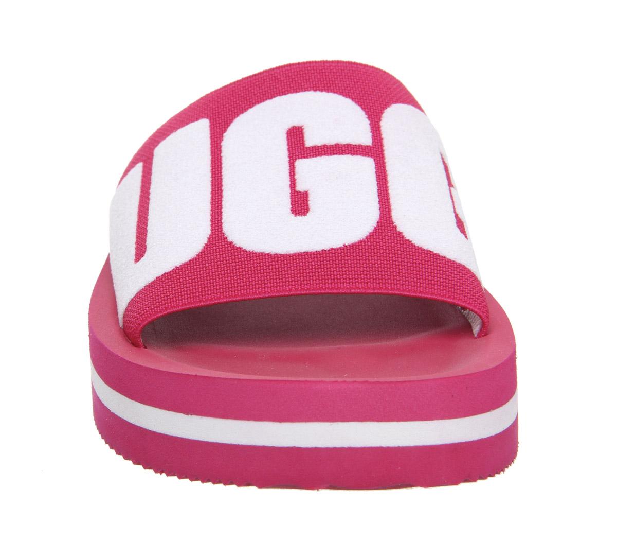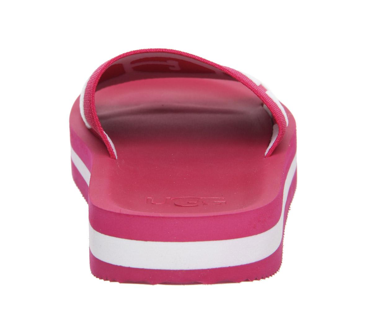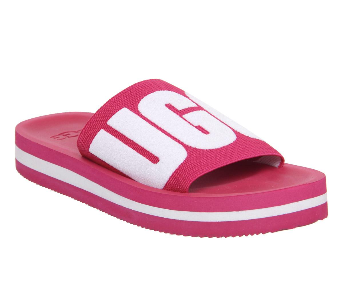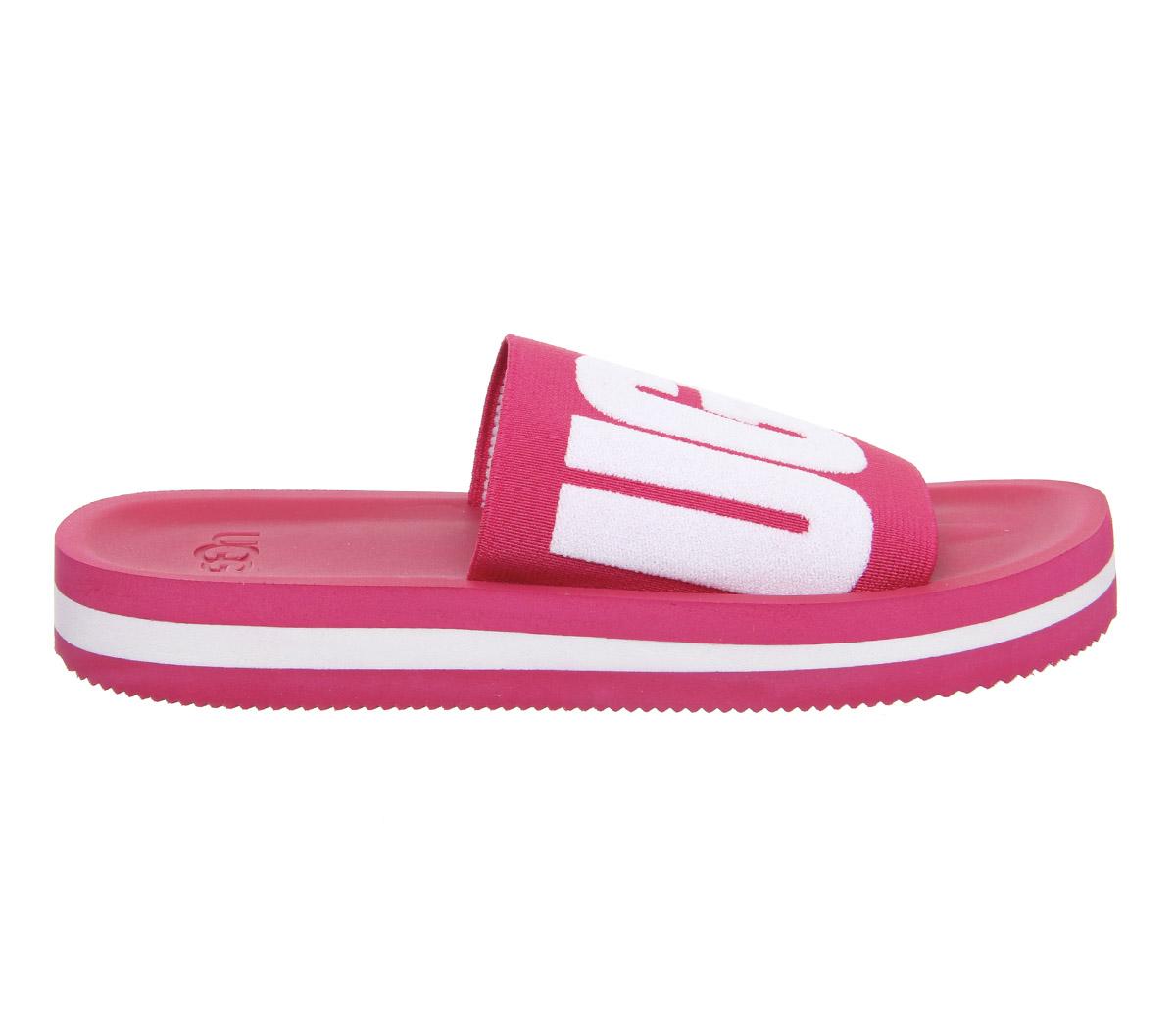 Bold graphic sliders, perfect for the city or beach. Featuring a bold woven elasticated upper and slightly elevated flatform. In a pink sweet sangria colourway.