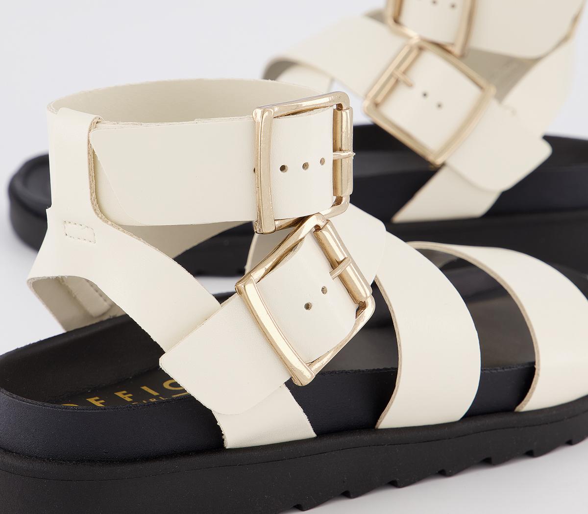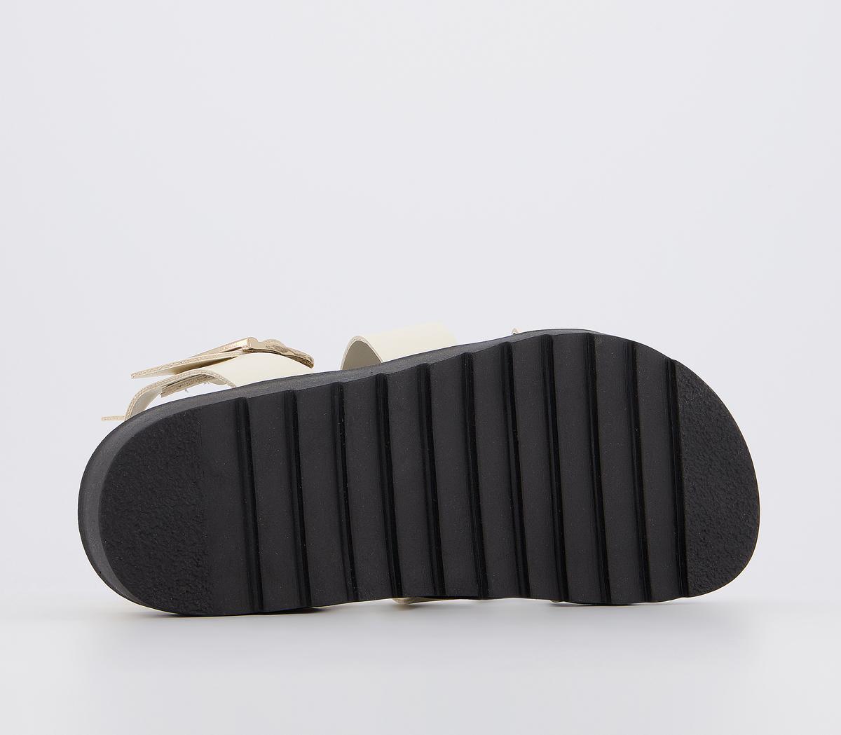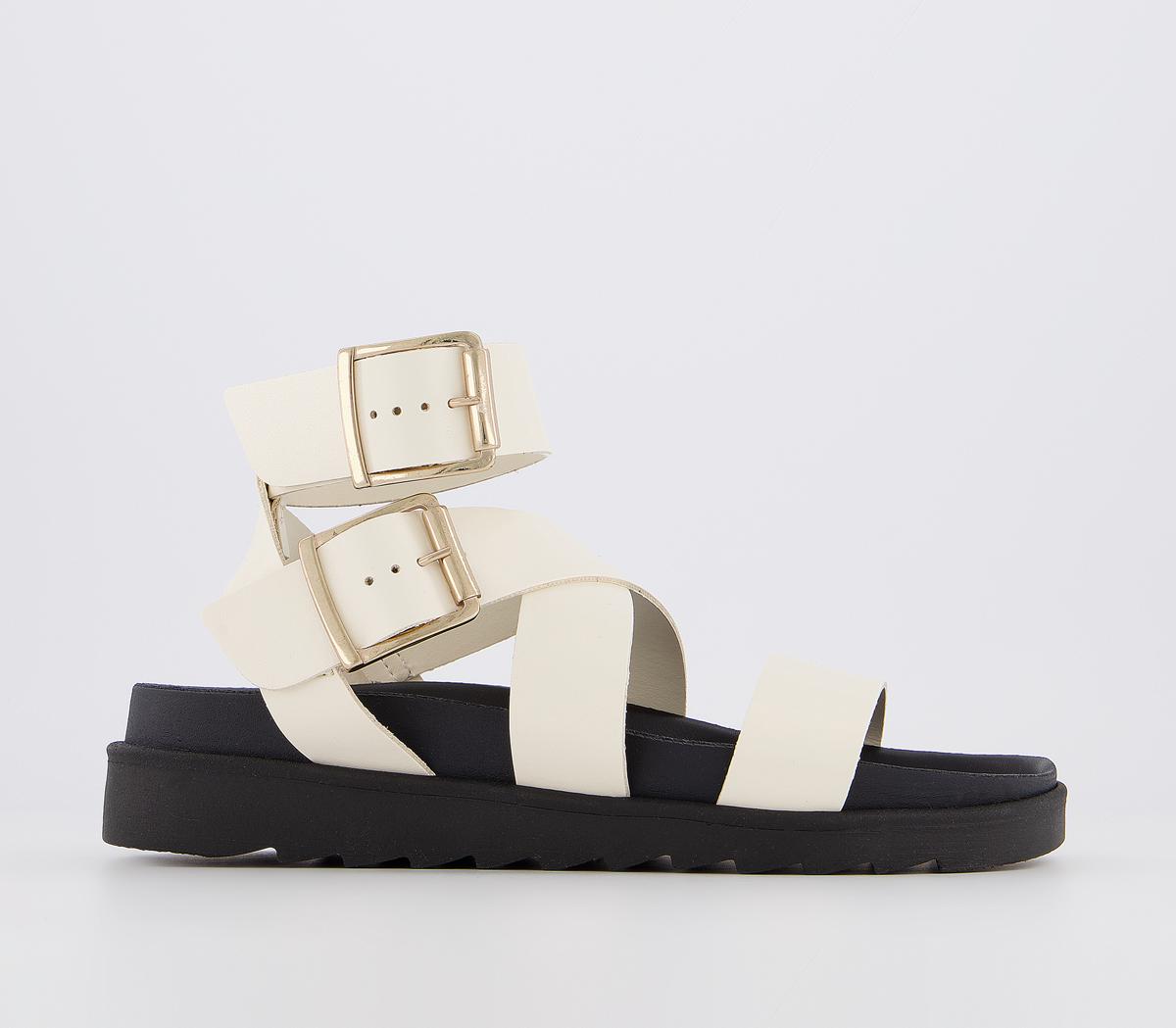 Summer essential style! A minimalistic, bold strappy silhouette on a moulded footbed. Featuring adjustable double buckles. In an off-white colourway, finished with gold buckles