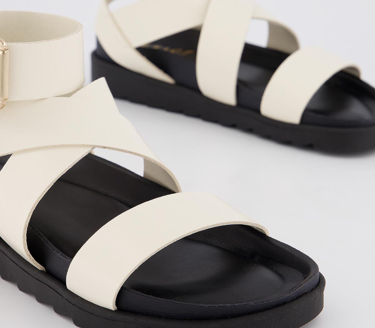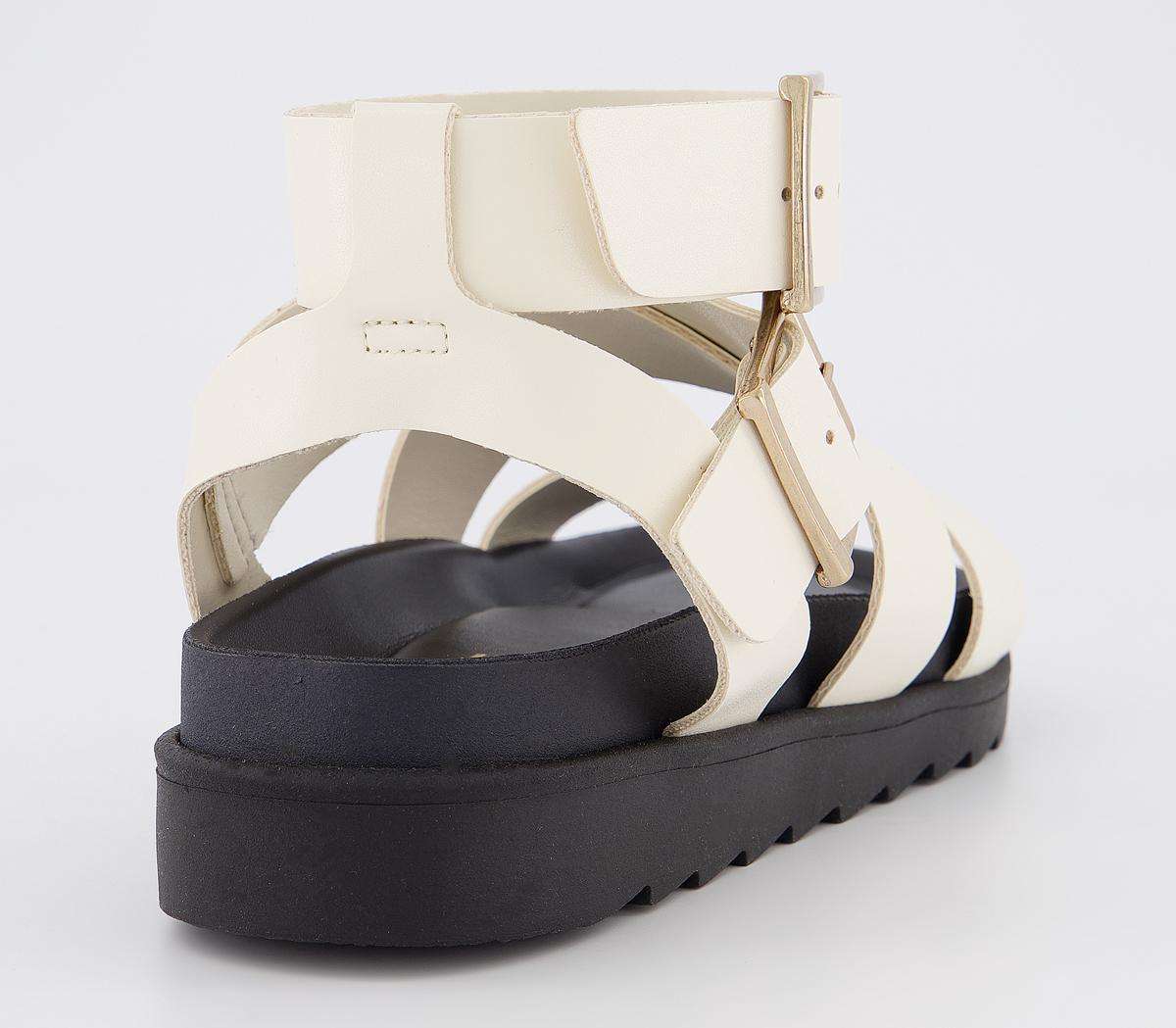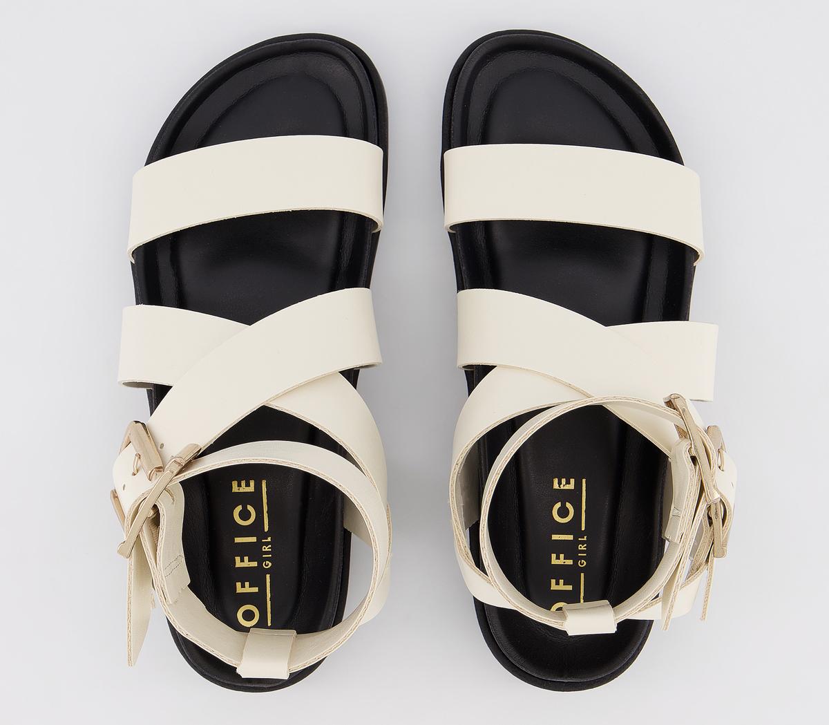 Summer essential style! A minimalistic, bold strappy silhouette on a moulded footbed. Featuring adjustable double buckles. In an off-white colourway, finished with gold buckles