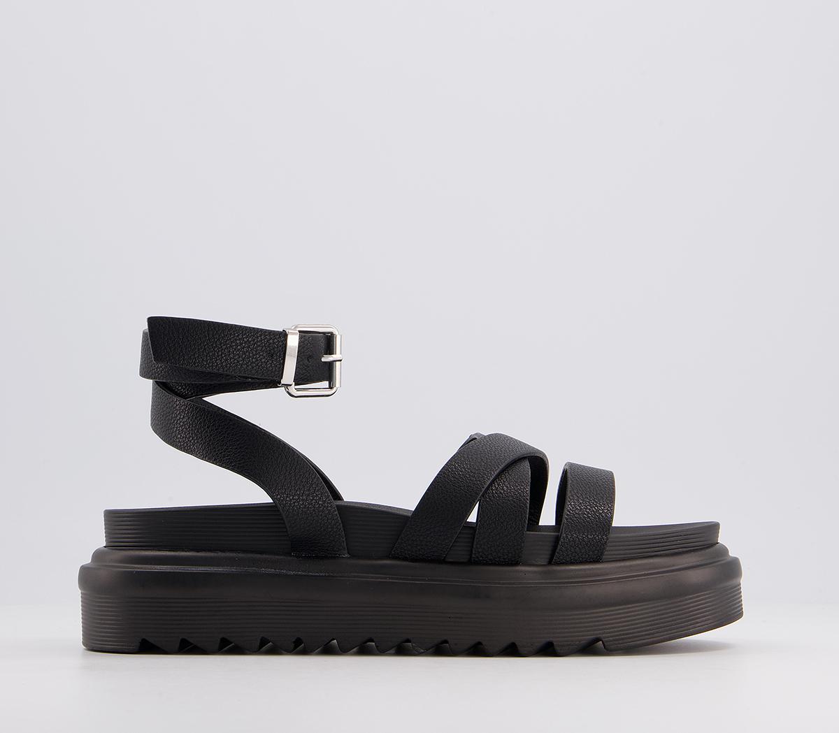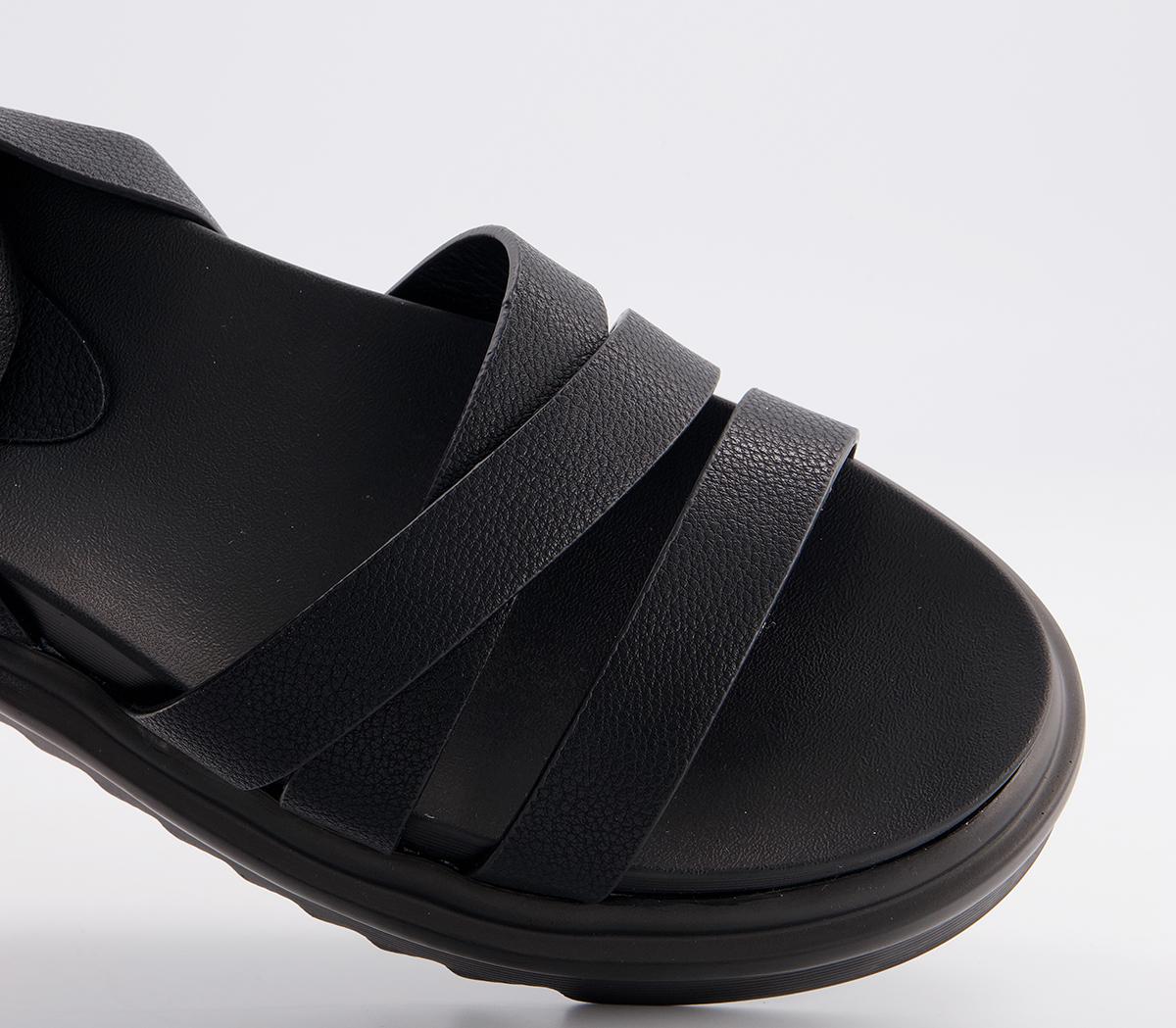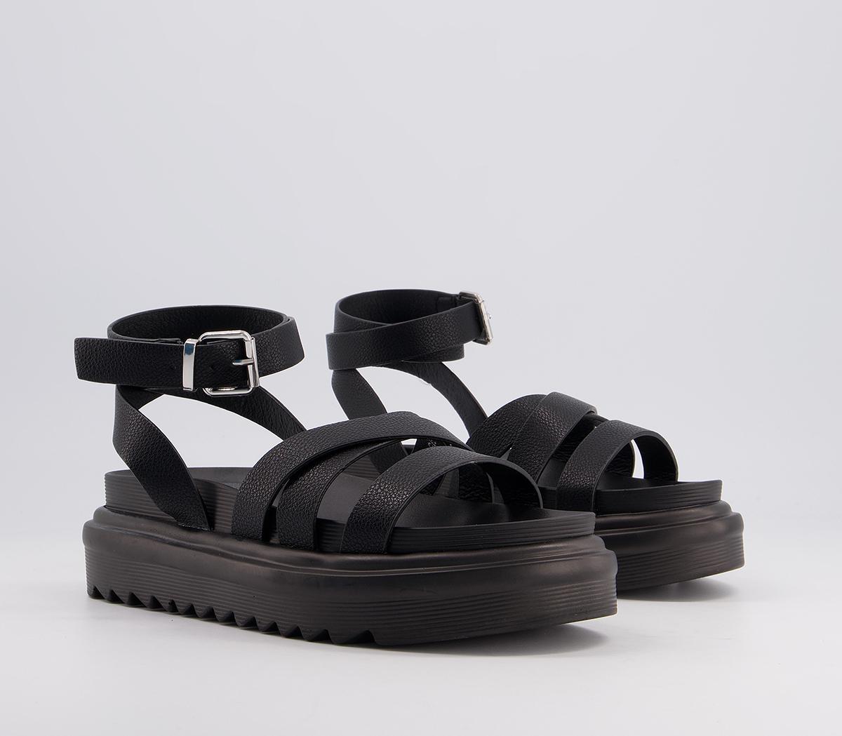 Slip into these sandals with anything in your wardrobe, featuring black faux leather uppers, multiple straps, ankle strap with buckle fastening, sitting on a chunky rubber sole.