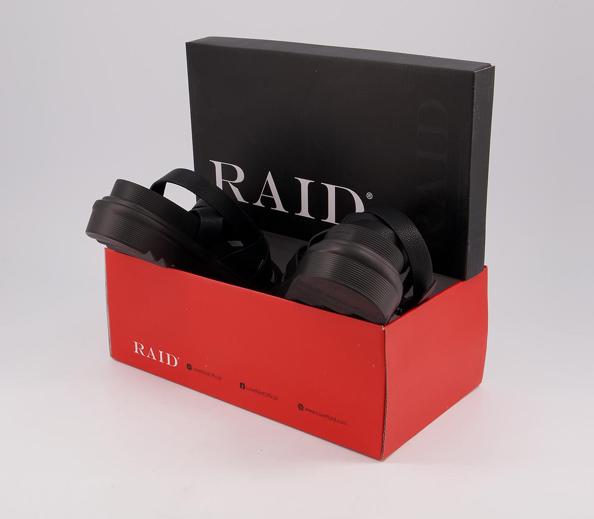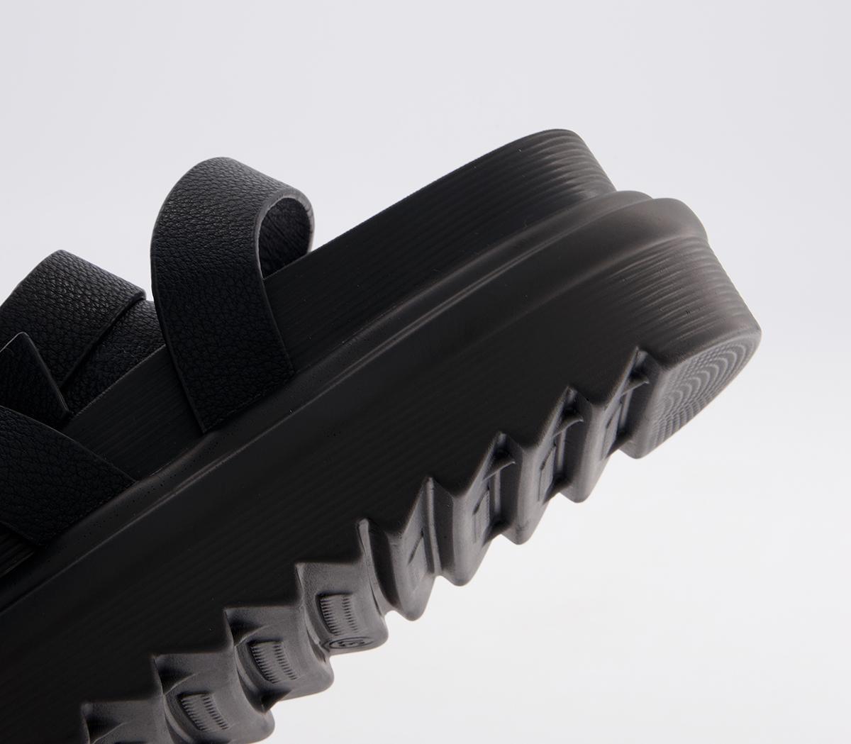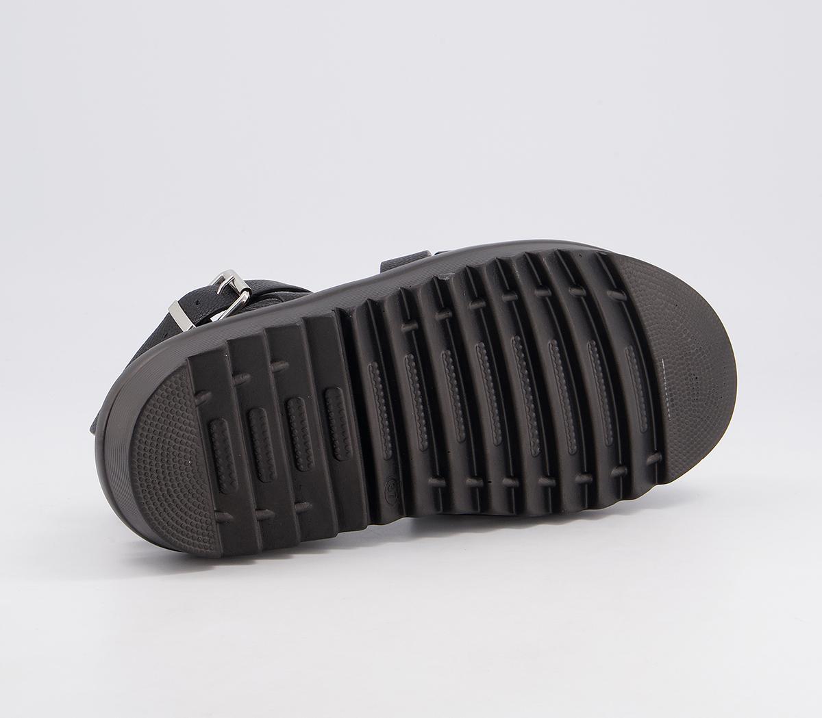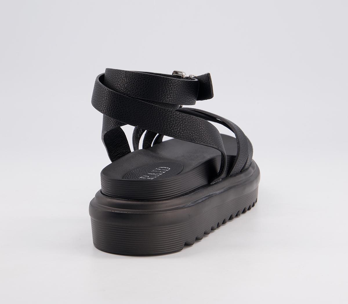 Slip into these sandals with anything in your wardrobe, featuring black faux leather uppers, multiple straps, ankle strap with buckle fastening, sitting on a chunky rubber sole.
