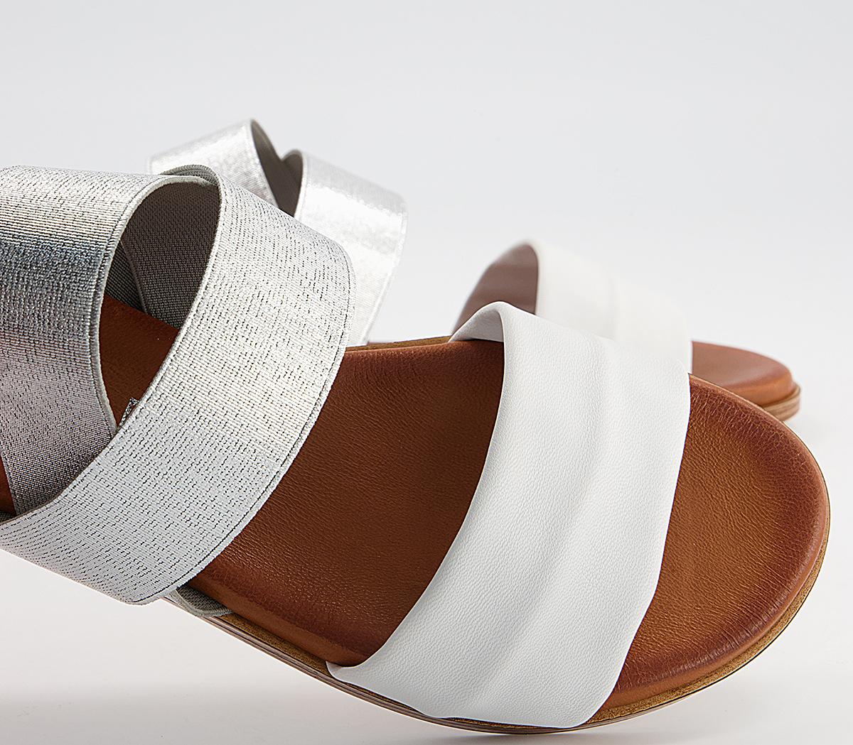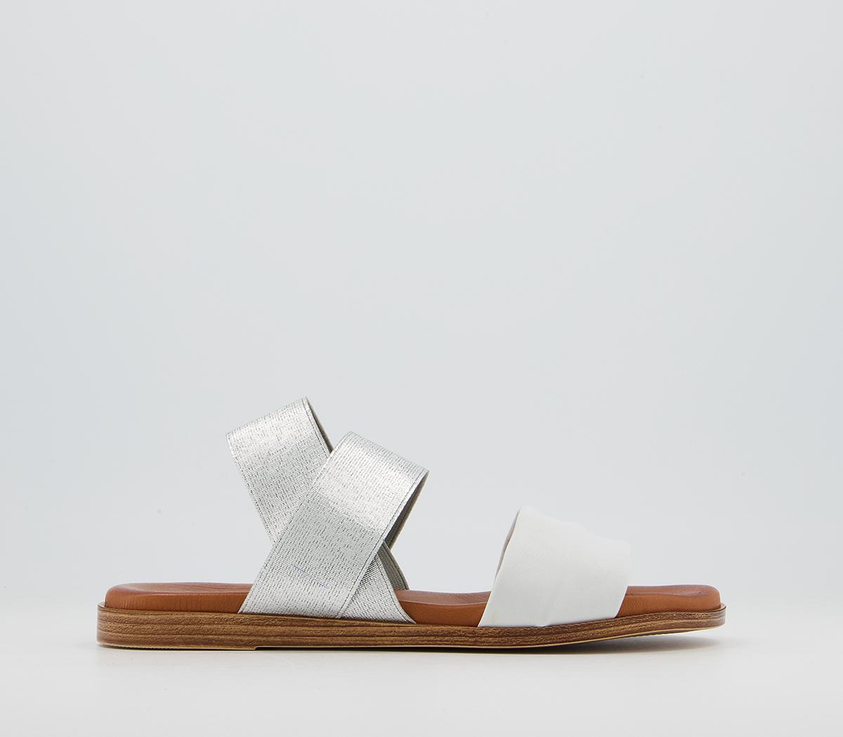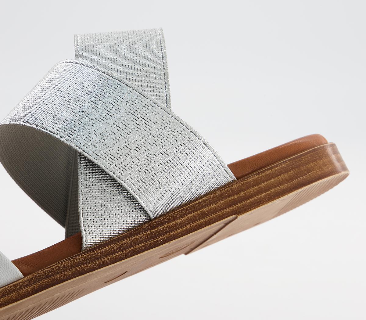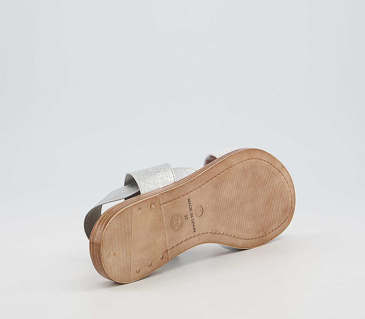 A flat sandal with silver elastic leather straps, with a soft comfort innersole.