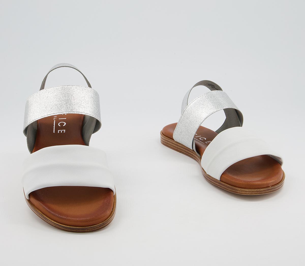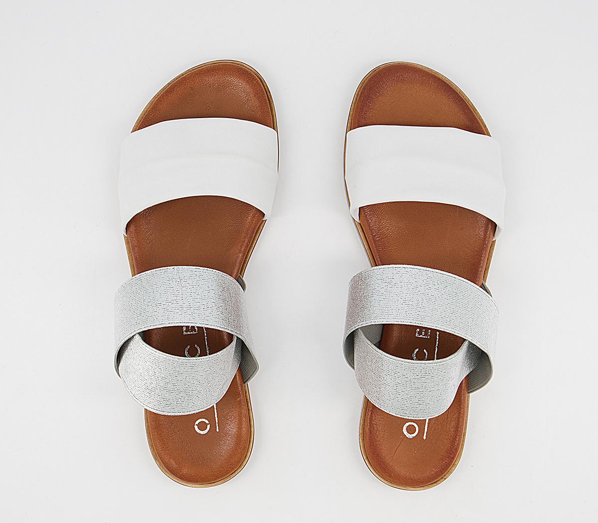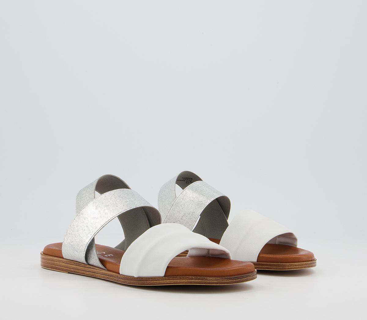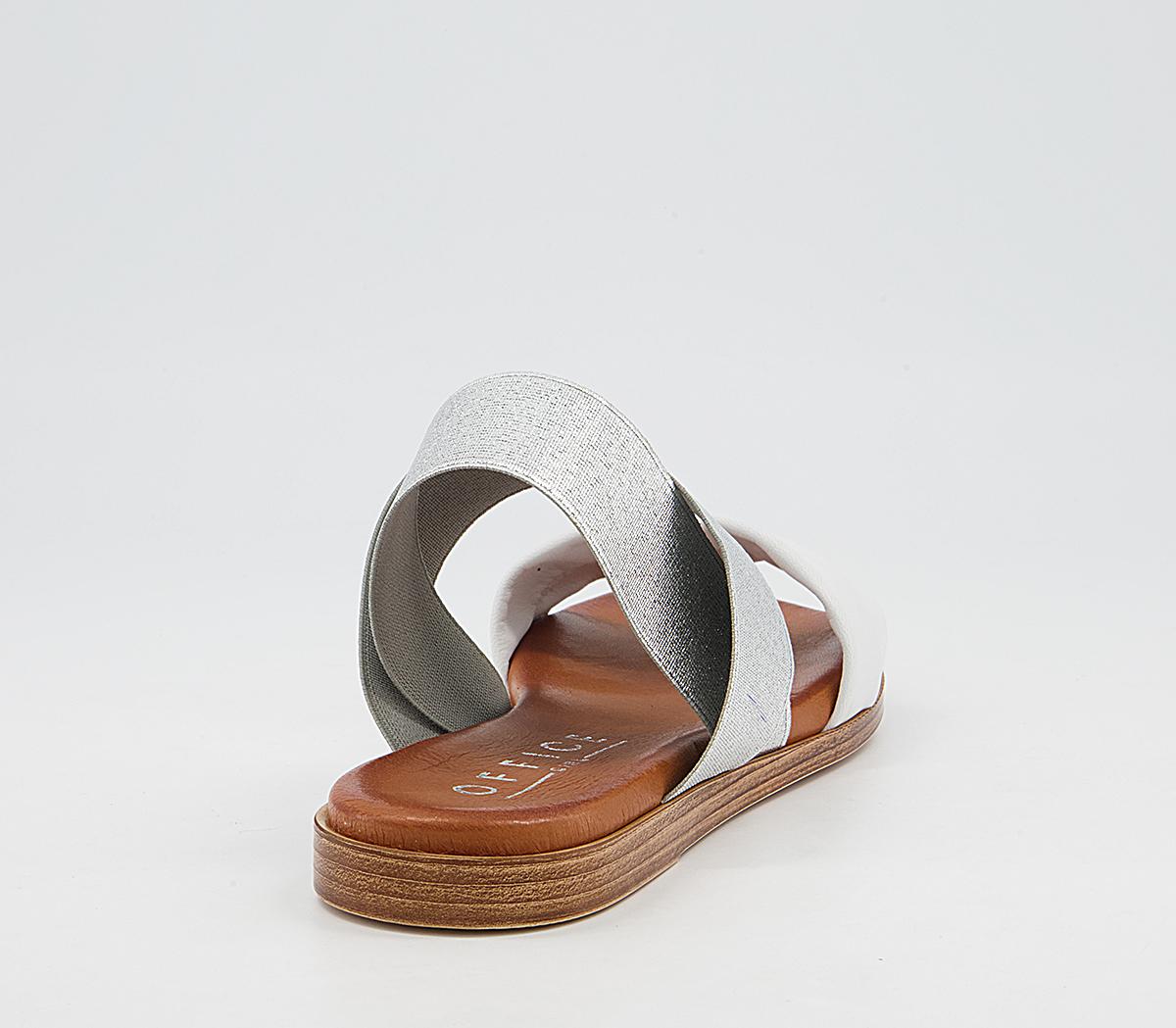 A flat sandal with silver elastic leather straps, with a soft comfort innersole.
